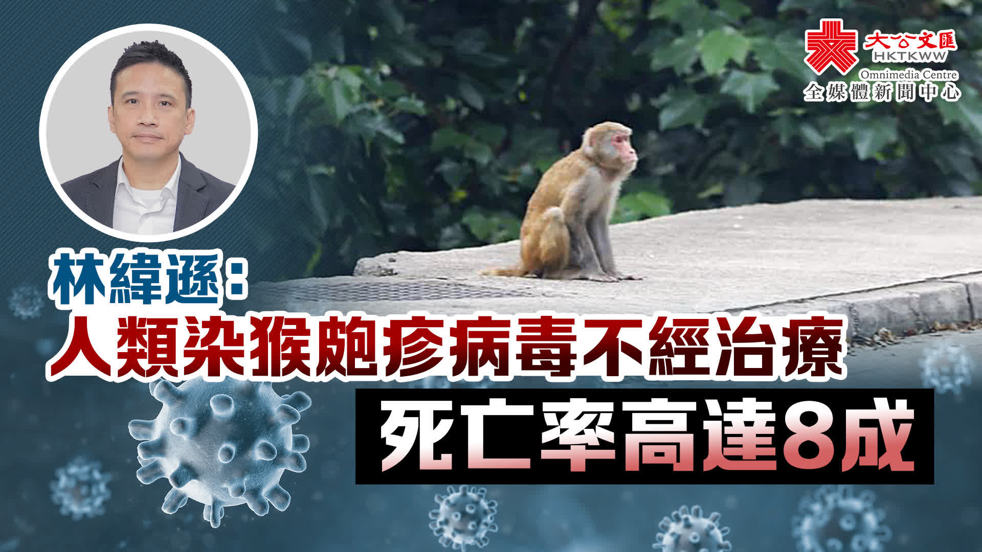 感染及傳染病醫學會會長林緯遜表示,人類感染「猴皰疹病毒」屬罕見,病毒在彌猴常見,嚴重性不高,很多時只有輕微甚或沒有病徵。但當病毒傳播至人類,嚴重性便大不同,如果不經任何治療,死亡率可高達80%。病毒有機會進入人體的中樞神經系統,對腦部及脊椎神經造成相當大破壞。