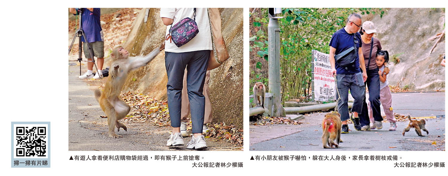 有遊人近距離拍攝猴子,甚至有年輕男子拿着水樽對猴子做出挑釁動作,被猴子一路尾隨。但亦有遊人與猴子保持距離,有小朋友被突然靠近的野猴嚇到,被家長護在身邊快步遠離。大公報記者採訪期間,一隻猴子突然靠近,試圖搶奪記者肩上的手袋。行山徑旁,有外籍遊人坐下野餐,他們攜有長棍,幾隻猴子在附近徘徊並虎視眈眈,未敢上前。