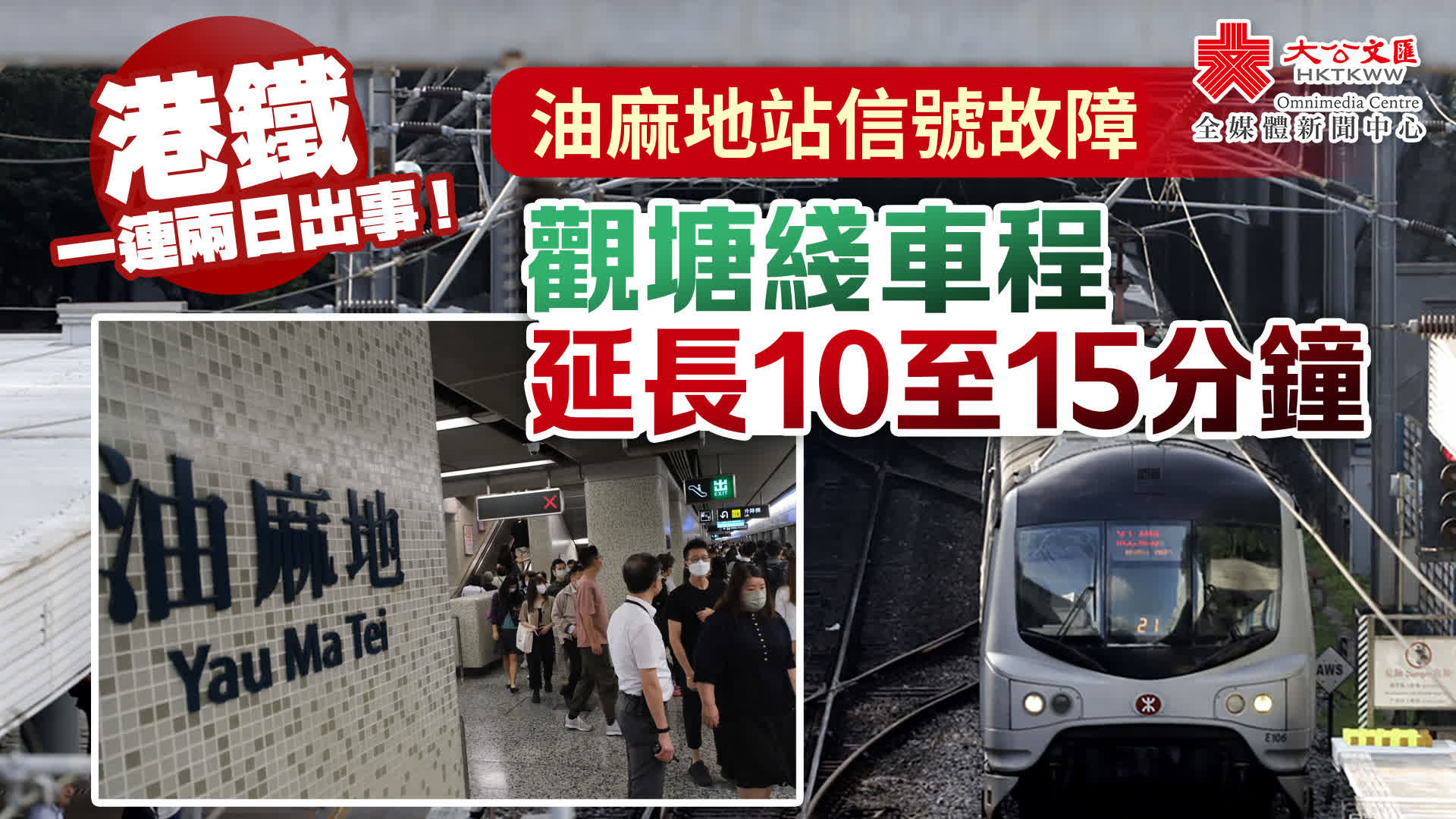 大公文匯全媒體報道,港鐵列車服務再度出現延遲。港鐵表示,油麻地站有信號故障,觀塘綫全綫車程延長10~15分鐘。