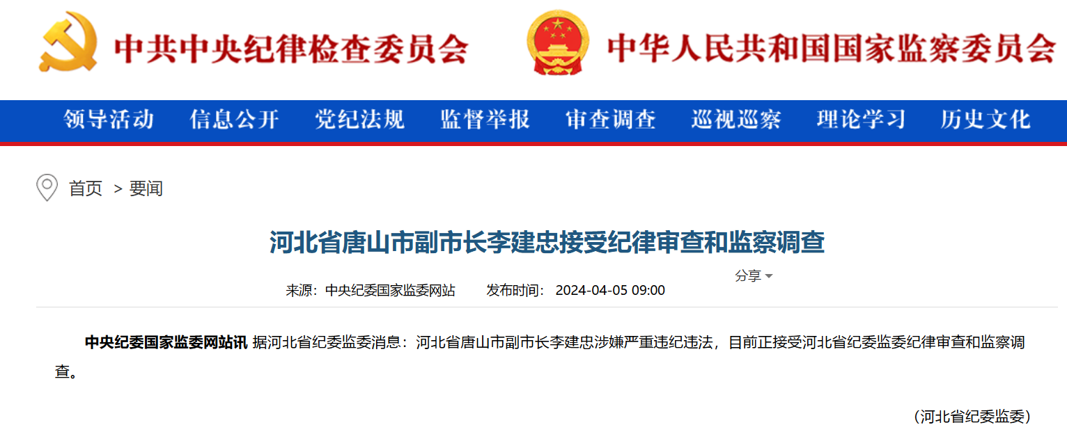 據中央紀委國家監委網站消息,河北省唐山市副市長李建忠涉嫌嚴重違紀違法,目前正接受河北省紀委監委紀律審查和監察調查。
