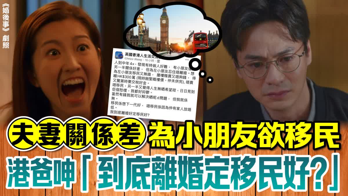 該名港爸在fb群組「英國香港人生活交流區」發文稱,「人到中年4X,發現有時做人好難,有小朋友後同另一半關係好差,但為咗小朋友忍住唔離婚。」然而,他為了小朋友打算移民,但指自己無錢,「層樓賤賣又唔夠錢,得嗰HK$300萬」,而且現時蝕緊樓價,亦未供完,又擔心唔賣將來要交稅。樓主提到生活有壓力,「唔移民,另一半又覺得人生無晒希望咁,日日見到佢個愁樣,我都好抑鬱」,他慨嘆「移民係想下一代好,唔移民係因為仲有家人放唔低」,遂問網民到底離婚定移民好喎。
