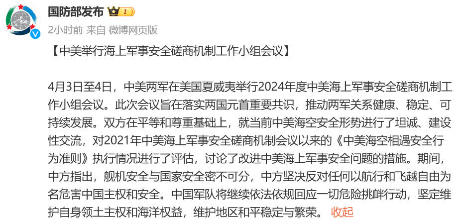 據國防部新聞局官方微博消息,4月3日至4日,中美兩軍在美國夏威夷舉行2024年度中美海上軍事安全磋商機制工作小組會議。