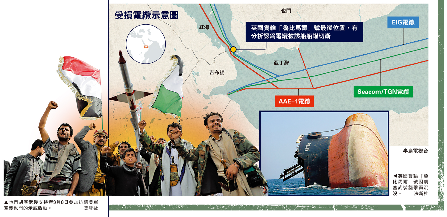 A: 以色列及其西方盟友指責也門胡塞武裝破壞電纜,亦有分析認為電纜是被胡塞武裝此前擊沉的英國貨輪「魯比馬爾」號的船錨切斷。胡塞武裝否認與電纜受損事件有關,並表示是美英在當地的軍事行動導致電纜受損。