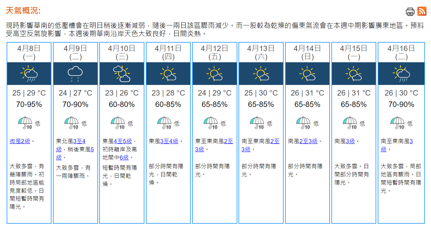 天文台表示,現時影響華南的低壓槽會在明日(8日)稍後逐漸減弱,隨後一兩日該區驟雨減少,一股較為乾燥的偏東氣流會在本周中期影響廣東地區。預料受高空反氣旋影響,本周後期華南沿岸天色大致良好,日間炎熱。預測本周六氣溫回升至30至31度水平,至下周初。
