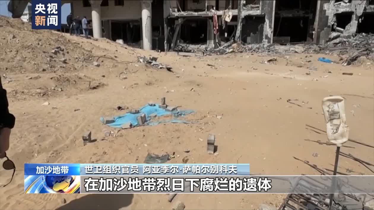 世衞組織官員 阿亞季爾·薩帕爾別科夫:在醫院的院子裏,你還能看到死去的人們的墳墓。有些人已經下葬,有些甚至還沒有下葬,因此,你可以在這裏,以及其他許多地方看到在加沙地帶烈日下腐爛的遺體。這太可怕了,簡直無法想像,這場戰爭應該立即停止。