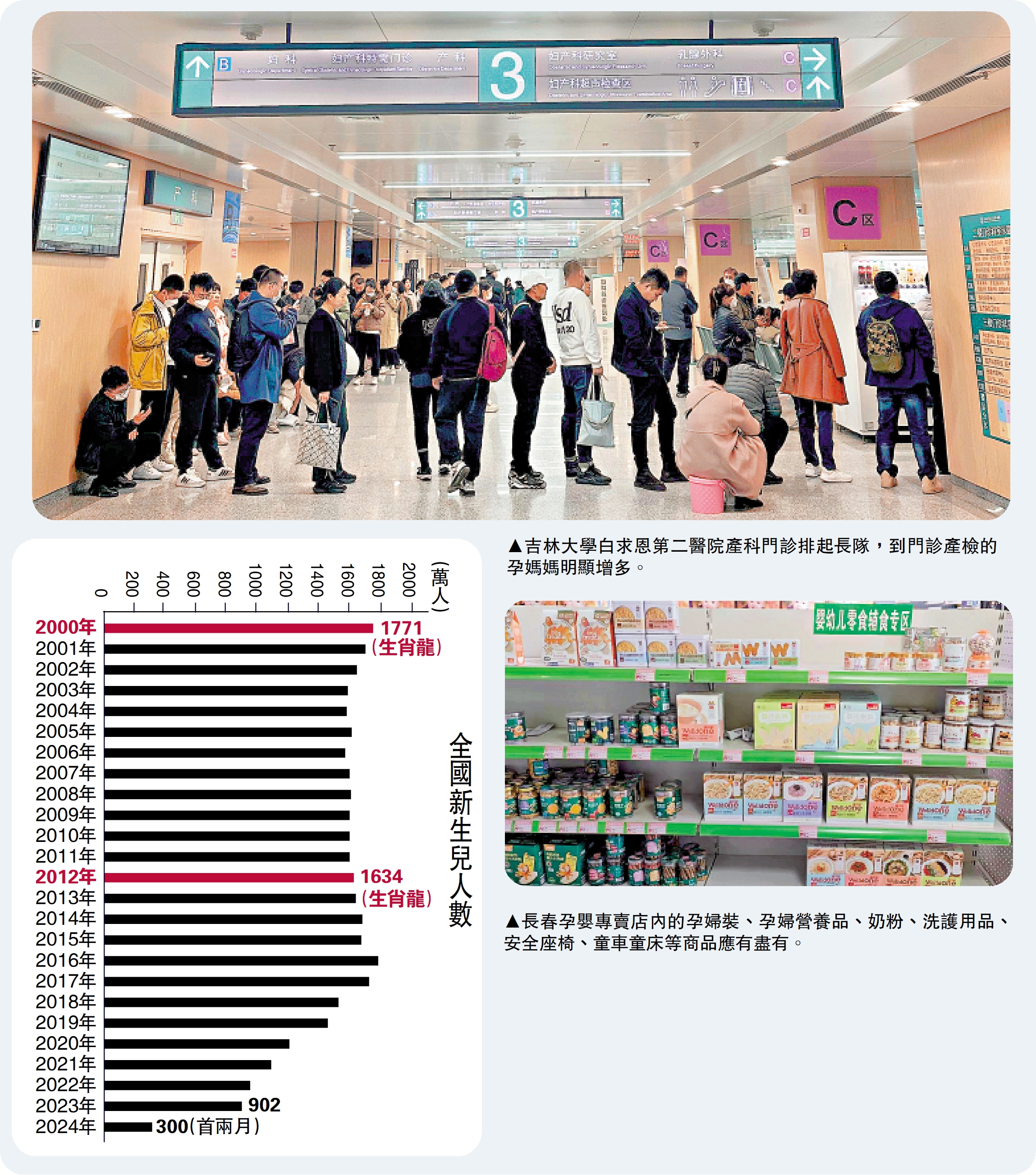 (大公報記者 盧冶 林凱)龍在中國文化中,具有祥瑞、權威和尊貴的象徵意義。衝着這些吉祥寓意,一些「望子成龍」的父母都希望趕在今年甲辰龍年生一個「龍太子」或「小龍女」。「自農曆新年大年初一以來至農曆二月二,我們產科共接生了933名龍寶寶,其中男寶寶483名,女寶寶450名,當中還包含了27對雙胞胎寶寶。與去年同期相比增長了約120%。預計孕婦數量比去年肯定是增長的,尤其上半年,預計接生寶寶數要比去年同期增長約40%。」吉林大學白求恩第二醫院分娩中心護士長褚艷如此說道。「龍寶寶」的出生潮,隨之而生的是醫院排長隊、月嫂難求、孕嬰產品價格堅挺等。