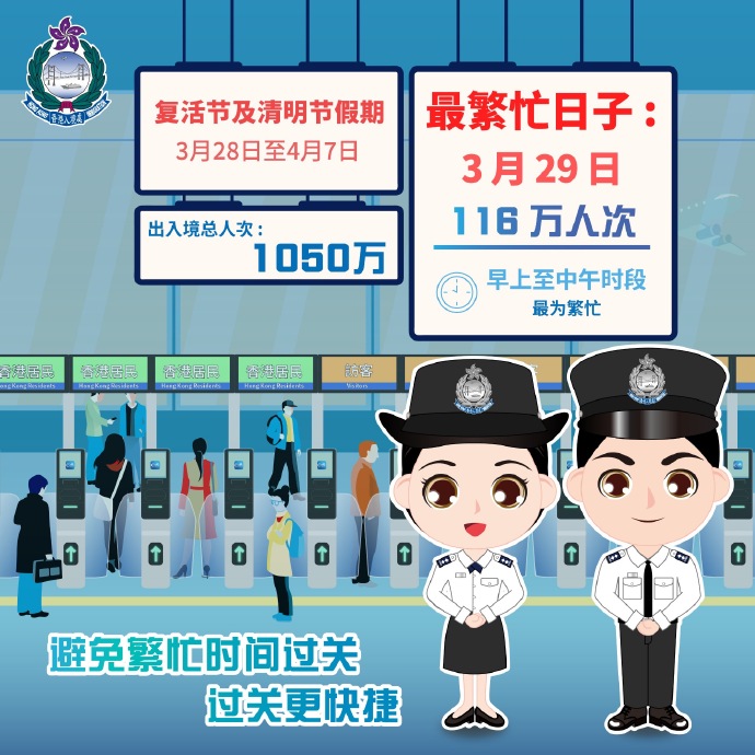 大公文匯全媒體報道,香港入境事務處今日(8日)表示,在剛過去的復活節及清明節假期期間(3月28日至4月7日),約1050萬人次經各管制站進出香港,每天平均有超過95萬人次出入境。長假期期間最繁忙的日子是3月29日,當天有超過116萬人次出入境,是自2023年通關以來的新高,當日早上至中午時分是出境高峰期,市民經多個管制站出境都需要較長時間。