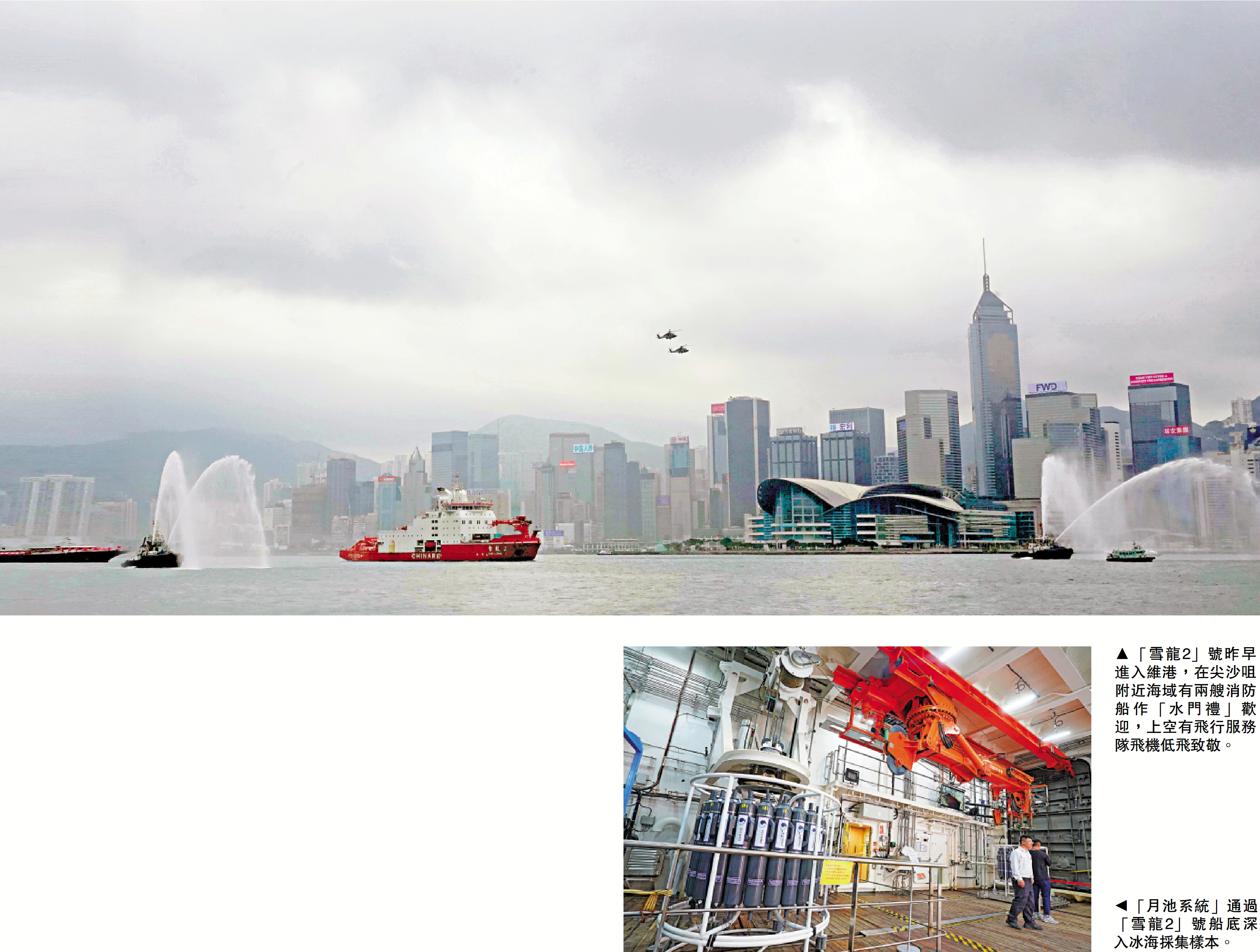 歷經五個多月南極科學考察,國家第一艘自主建造的極地科學考察破冰船「雪龍2」號凱旋回航,昨日首次訪港為期五天,上午進入維港獲海陸空盛大歡迎,大批市民駐足維港兩岸喝彩「打卡」。