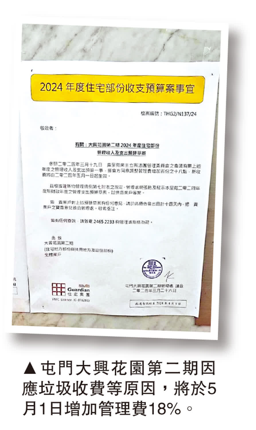 大公報記者昨日分別向屯門大興花園第二期業主立案法團及物管公司查詢。佳定物業管理有限公司回覆查詢表示,業委會已於4月8日發出通告,向業戶解釋調整管理費緣由。根據該通告,垃圾收費的實施細節目前仍存在變數,現時擬定的18%管理費調整主要考慮到屋苑由於樓齡漸增而面對各項維修費用上升的開支。現時有關管理費調整的諮詢期已延長至4月25日。
