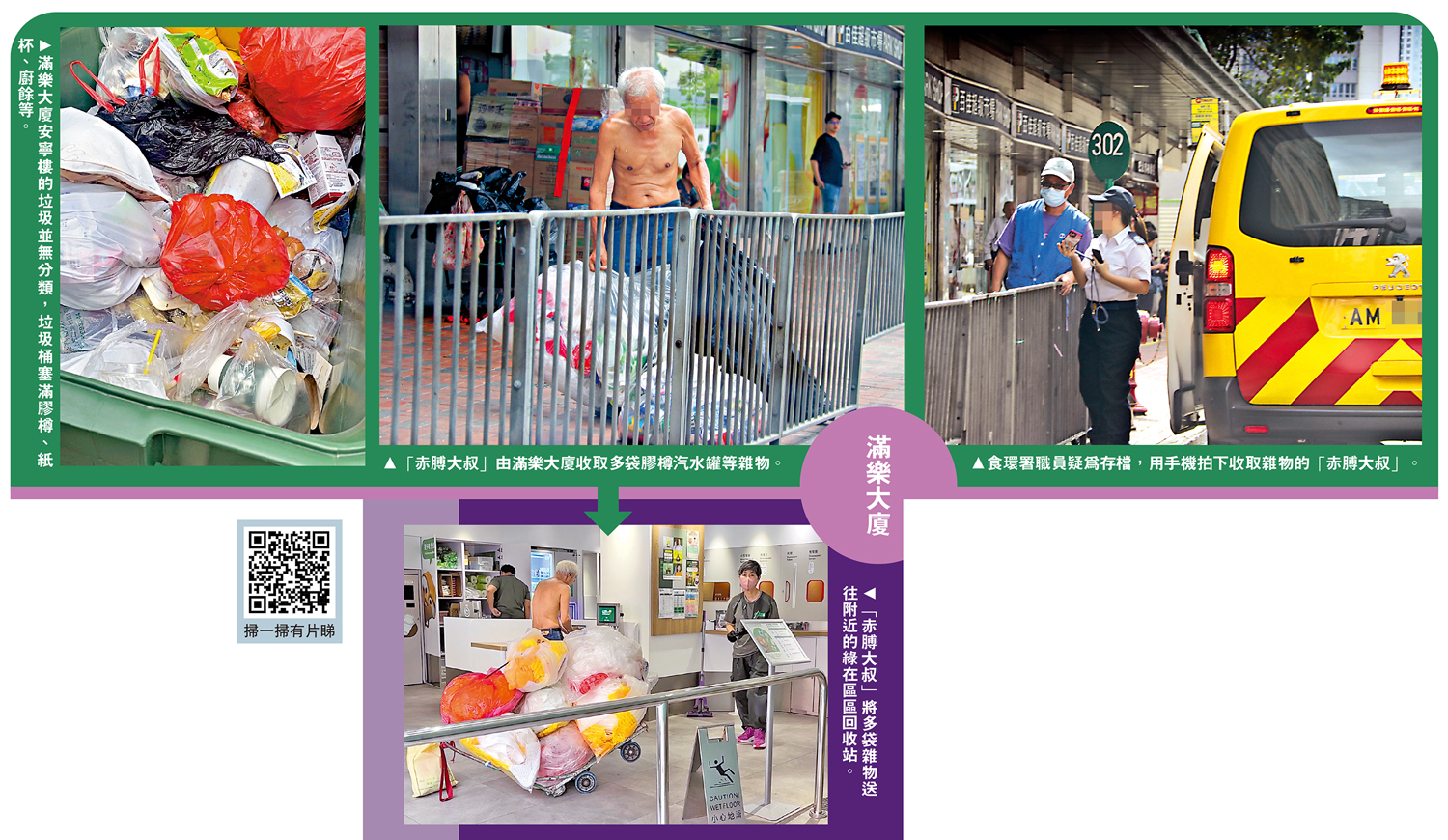 在上周四上午十時許,見到一名赤膊大叔拿着兩大袋空膠樽和空鋁罐,從滿樂大廈的福至樓步出,用手推車將兩大袋回收物品推到沙咀道福至樓門口路邊,並開始撕去膠樽上的招紙,並逐一將樽內殘留的液體倒掉。