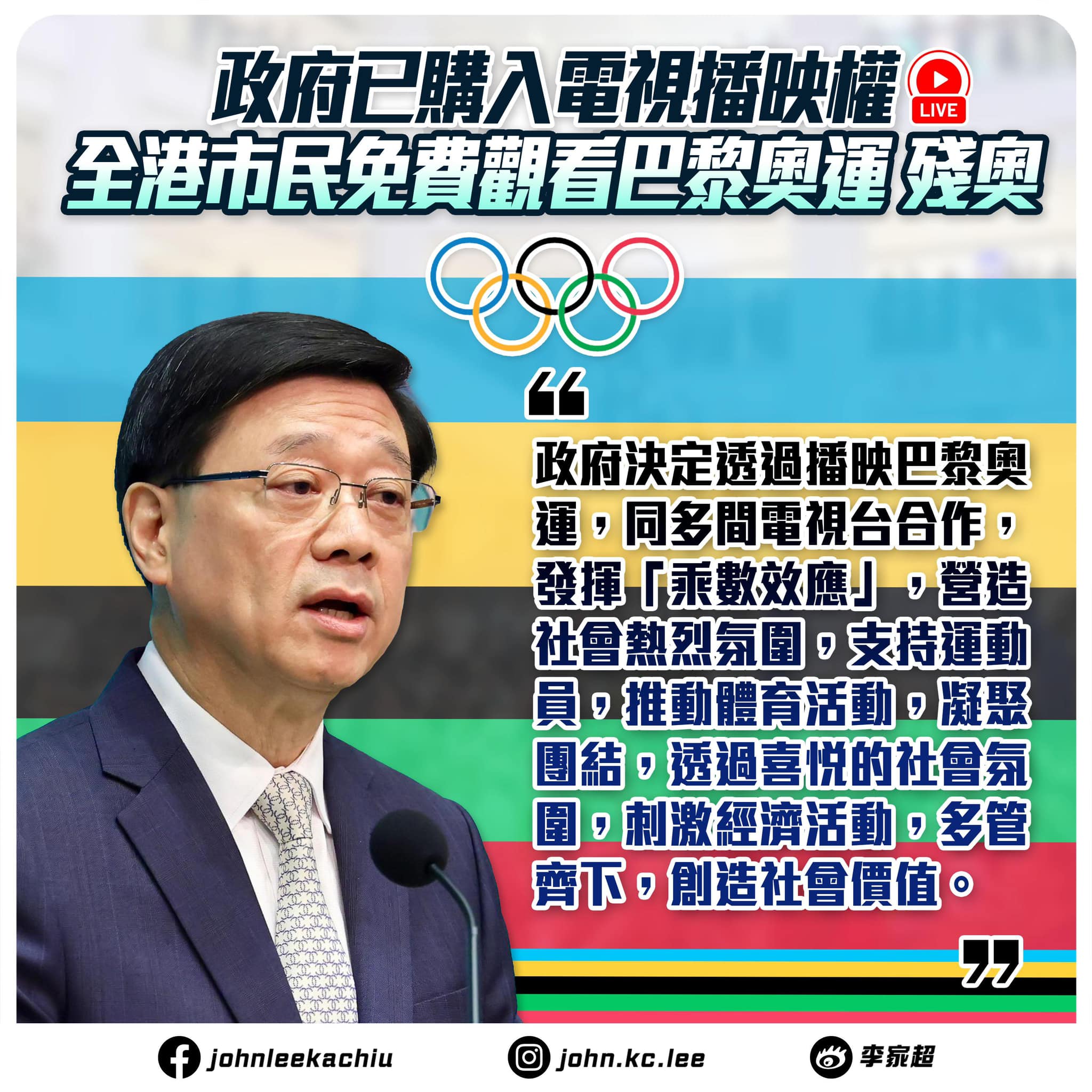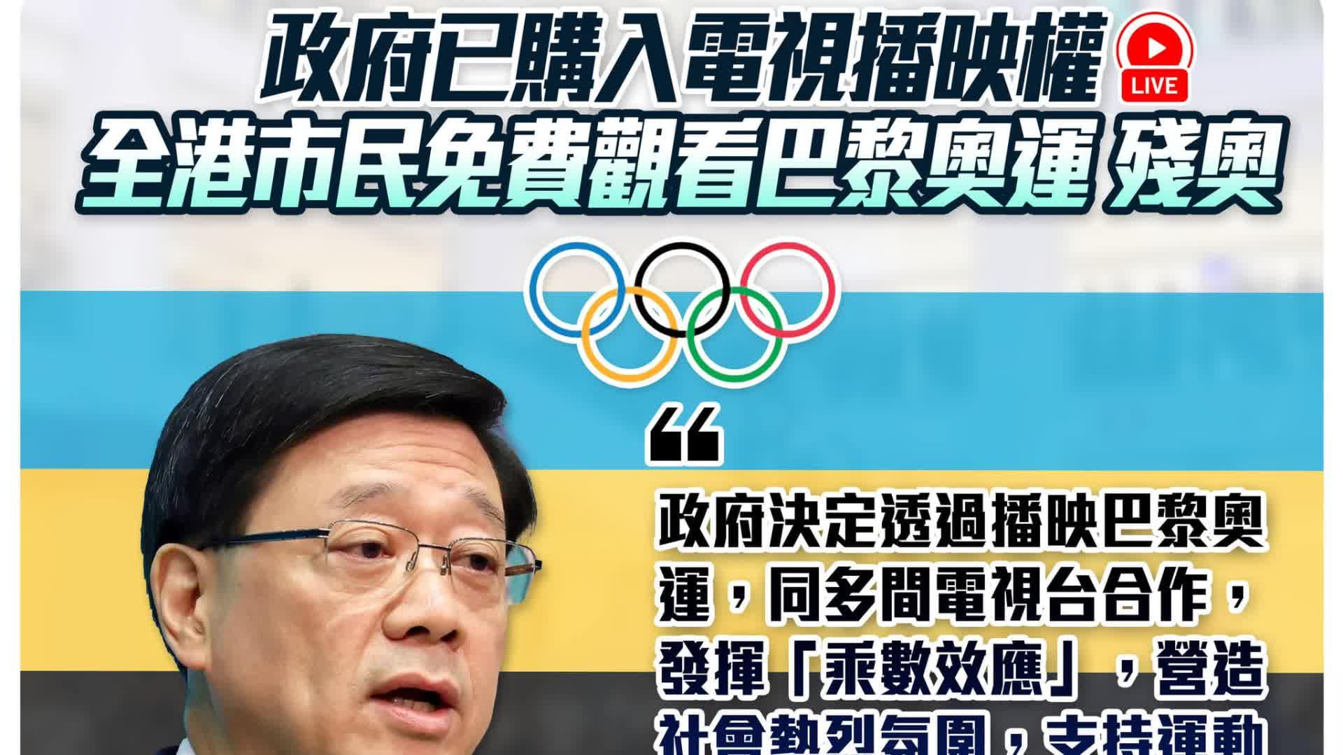 李家超表示,記得三年前轉播東京奧運帶來的社會價值,帶給整體市民的喜悅、團結以及為運動員取得優異成績的自豪,政府希望再次透過播映巴黎奧運,發揮「乘數效應」,營造社會熱烈氛圍,支持運動員,推動體育活動,凝聚團結,透過喜悅的社會氛圍,刺激經濟活動,多管齊下,創造社會價值。
