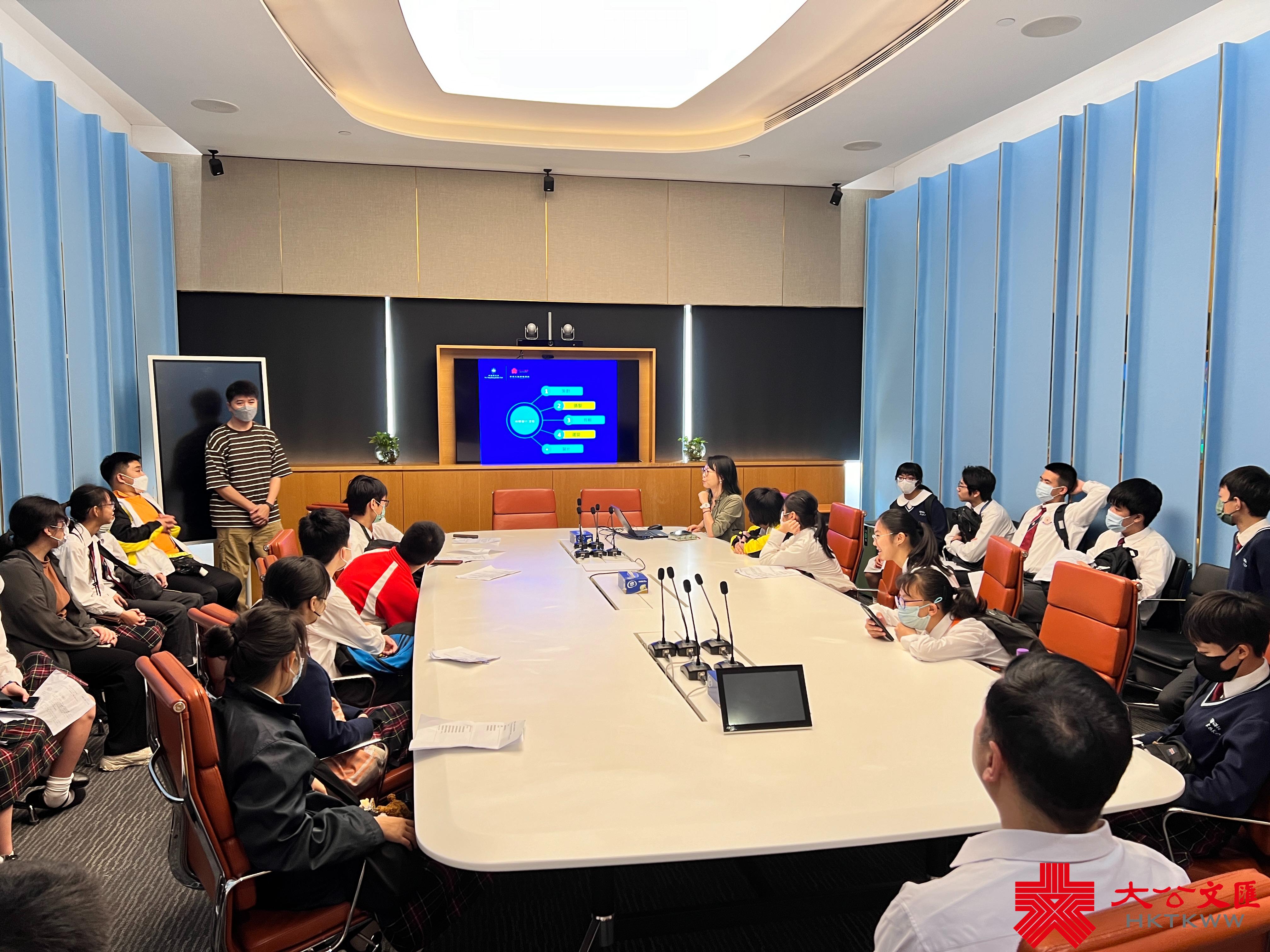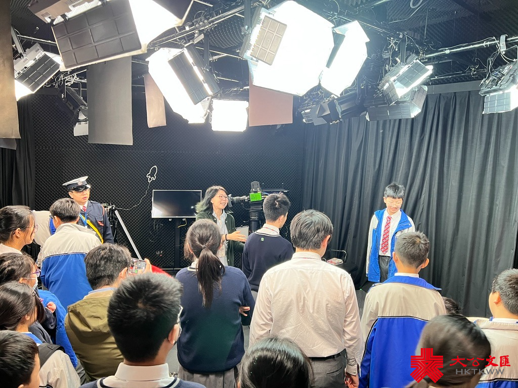 隨後,同學們到訪全媒體中心參觀,了解主播組、新聞編輯部與國際新聞部等單位的採編工作。在集團融媒工作部總監陶亮的帶領下,同學除了認識《點觀香港》數字人主播、新媒體平台矩陣等嶄新技術之外,還分組扮演主持人、受訪者、策劃、攝像等角色,體會到製作節目的策劃、攝製、剪輯、運營及製片過程。各人認真投入,扮演角色,令現場充滿戲劇性效果,笑聲連連。