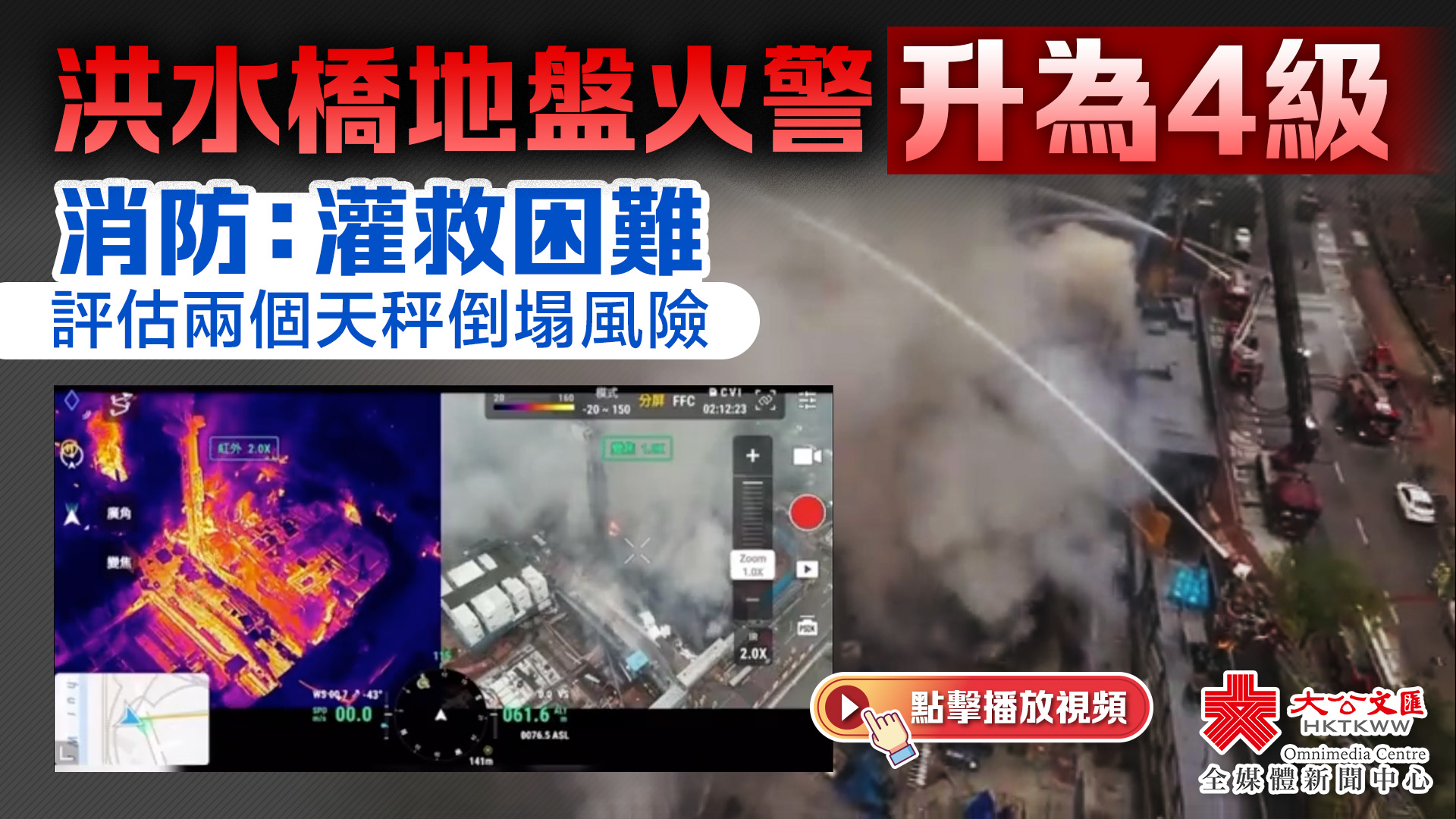 大公文匯全媒體報道,洪水橋地盤的火警焚燒約8小時後,在今日(9日)晚上9時半升為四級火警。