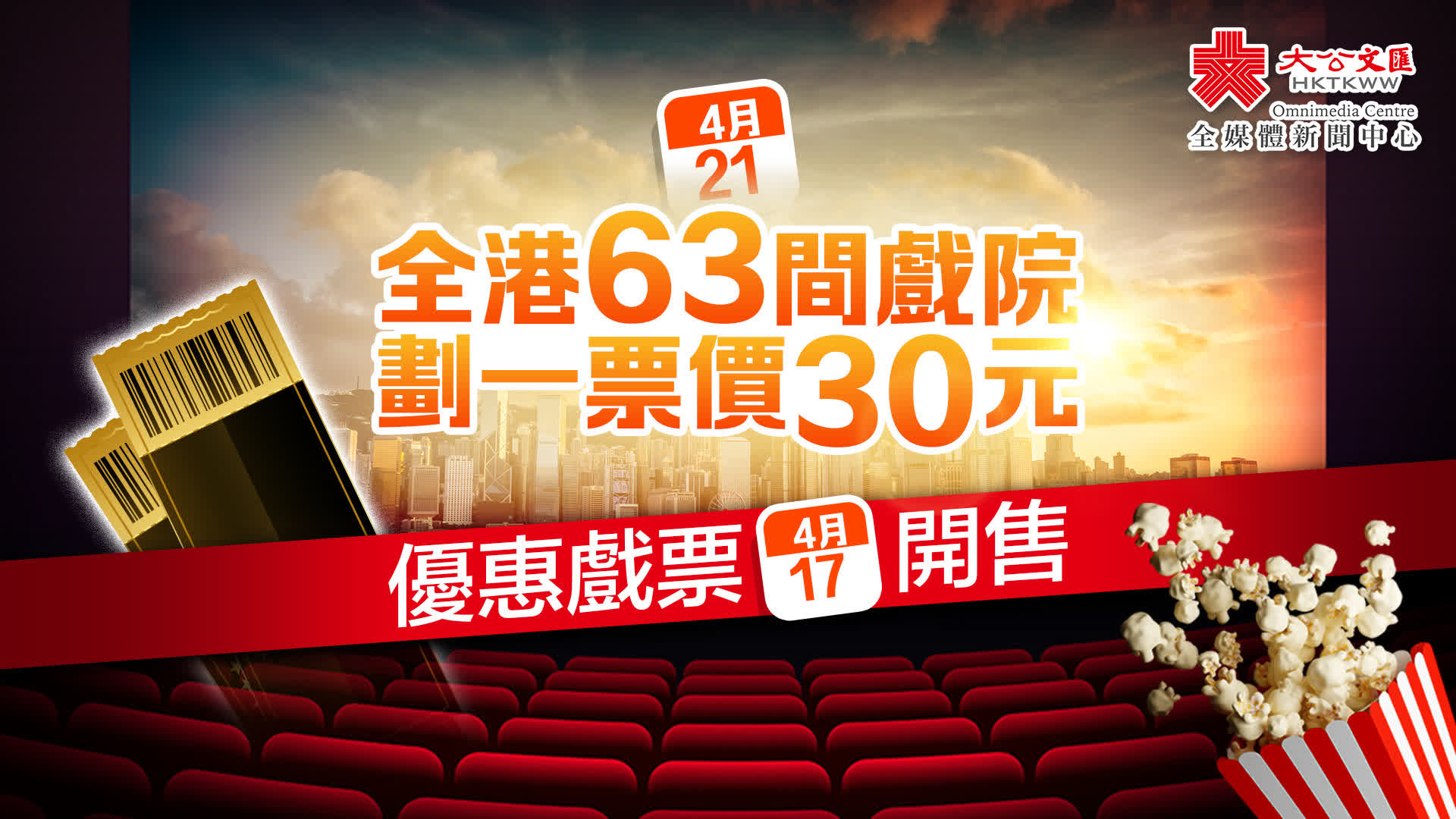 大公文匯全媒體報道,香港戲院商會今日(10日)公布,4月21日(星期日)為「全港戲院日」,全港63間戲院劃一票價30元。活動當日的戲票將於4月17日中午12時後,陸續於各大戲院票房及網上售票網頁公開發售。