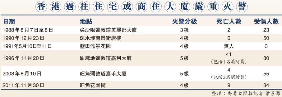 針對1987年前落成的舊式商住大廈消防問題,2007年的《消防安全(建築物)條例》規定有關大廈分階段提升消防設施,包括在公用地方要有自動噴灑系統、消防栓及喉轆系統、手控火警警報系統、緊急照明以及機械通風系統的自動中斷操作裝置等設備;住宅樓層亦要有消防栓及喉轆系統、緊急照明和手控火警警報系統等。此外,大廈亦須確保公用逃生途徑暢通,且要有防火門等。