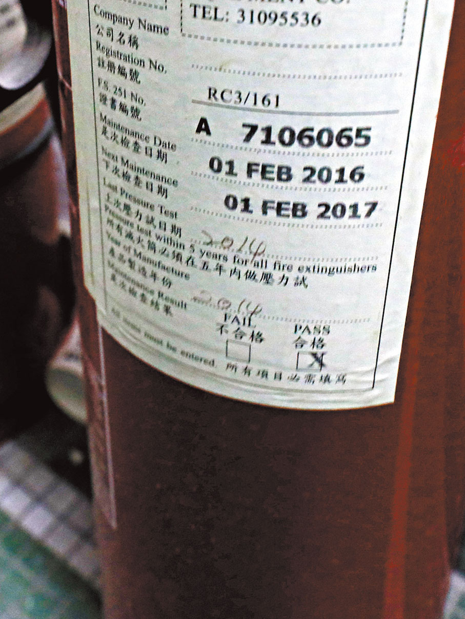 另外,現場不同樓層所見,防煙門並非關閉,一些防煙門被手提滅火筒頂着打開,更有防煙門破爛,門角貼滿膠布,根本不能在火警時發揮防火防煙作用。此外,住宅樓層雖放有手提滅火筒,但記者查看多個滅火筒也已過期,如有滅火筒標貼顯示對上一次檢查日期為2018年,下次要在2019年檢查,但標貼未有更新,即滅火筒過期未作檢查,更有滅火筒8年未再檢查。