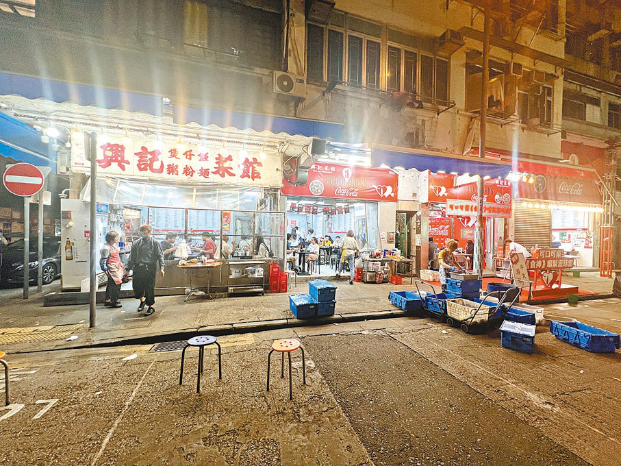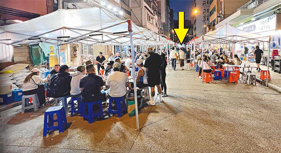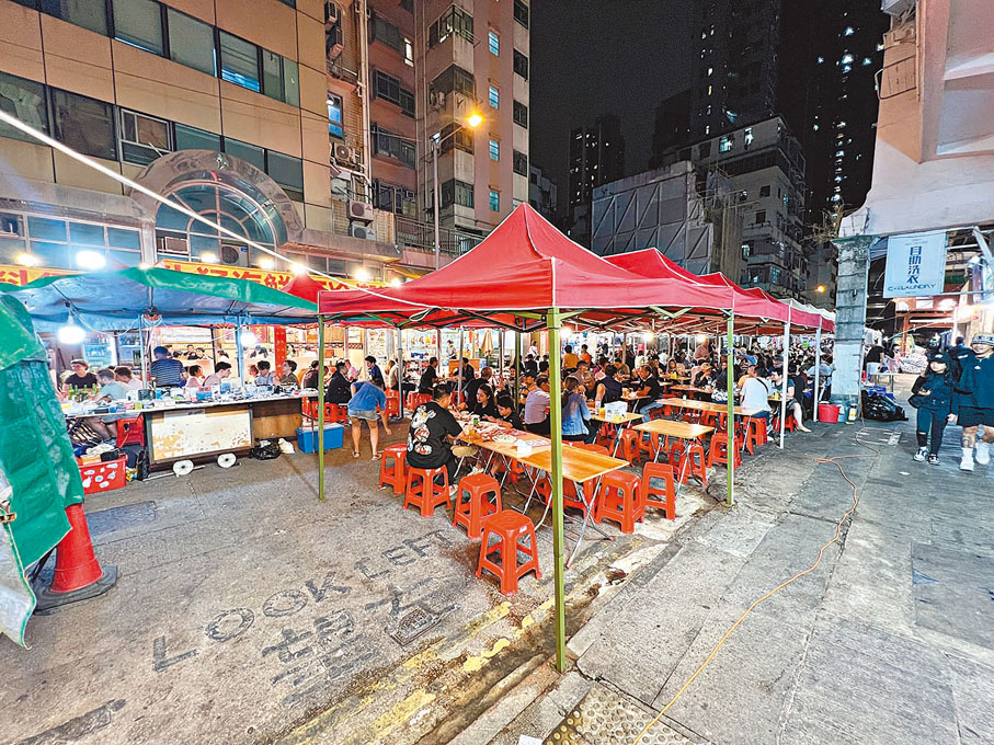 香港文匯報記者日前現場直擊,發現油麻地廟街入夜後車水馬龍,地下多間食肆忙於接待源源不絕的食客。各間食肆都在處所範圍內營業,唯獨熙龍里至永星里段的兩間食肆公然霸佔店前的行人路,擺放枱凳招待客人。