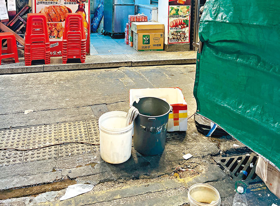 無牌經營兼阻街所帶來的另一影響就是衞生環境堪憂,除了隨處可見的雜物及垃圾堆砌,記者還在其路邊用餐區域旁聞到陣陣酸臭味,低頭一看,滿地的煙頭、紙巾等,伴着油污流進路邊的雨水渠。