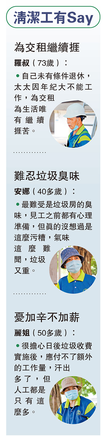 願意做這份工作,背後都有一定的苦衷。有七旬退休地盤工為交租折腰,也有家庭主婦為增加收入照顧小孩而不辭勞苦,他們都擔心垃圾收費帶來的額外工作量。清潔公司負責人表示,屆時會加人工及增人手,希望政府盡責做好屋邨管理,例如對住戶損屋邨環境衞生的不當行為扣分,增強阻嚇力以減低清潔工友的負擔。