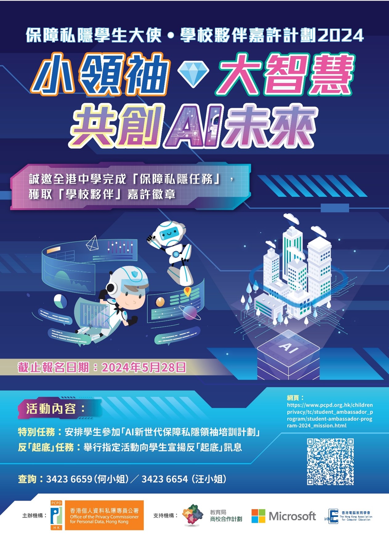 AI新世代保障私隱領袖培訓計劃以「小領袖 大智慧 共創AI未來」為主題,讓參與的學生透過專題講座、與保障資料主任交流,及Microsoft香港合辦的AI實踐工作坊等活動,認識個人資料私隱管理系統的實際運作,以及符合道德的AI應用標準,為踏進AI世代的職場環境作好準備。