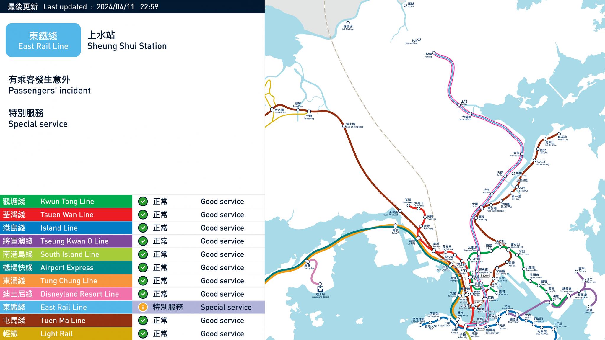 港鐵指,現時東鐵綫粉嶺來往羅湖站/落馬州站暫停服務。來往金鐘至粉嶺站維持10分鐘一班車。