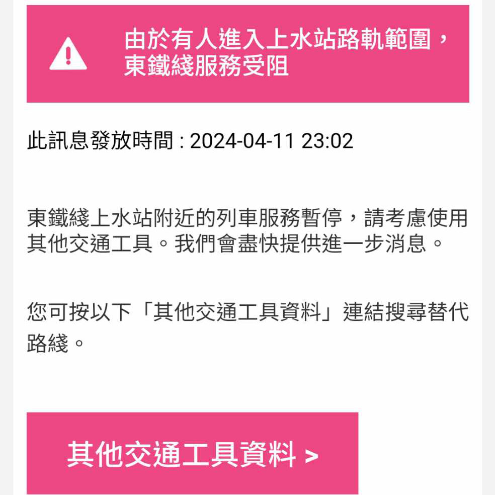 大公文匯全媒體報道,港鐵表示,有人進入東鐵綫上水站路軌範圍,東鐵綫服務受阻。警方於今日(11日)晚上11時03分,接獲上水站職員報案指有人墮軌。