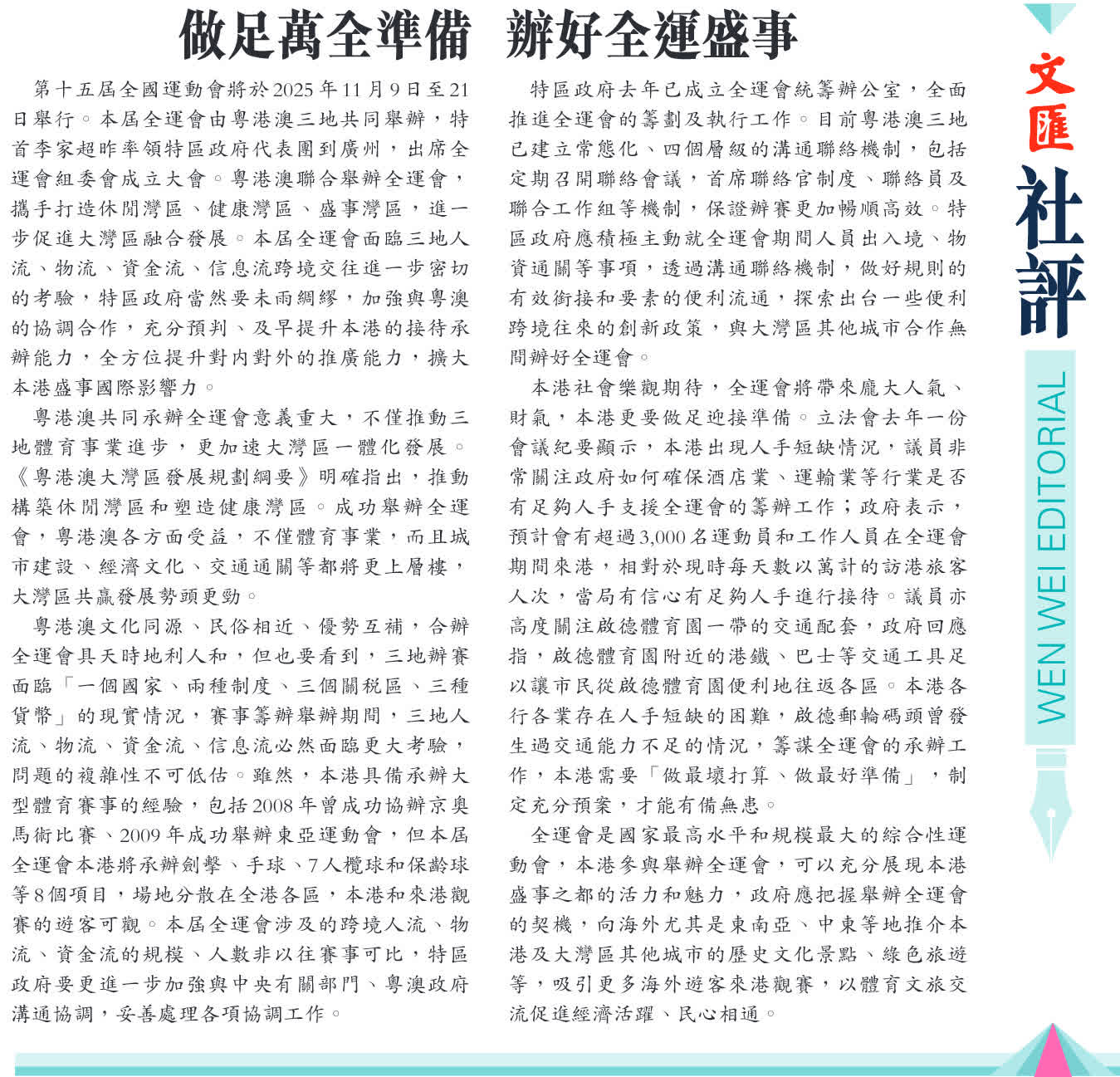 第十五屆全國運動會將於2025年11月9日至21日舉行。本屆全運會由粵港澳三地共同舉辦,特首李家超昨率領特區政府代表團到廣州,出席全運會組委會成立大會。粵港澳聯合舉辦全運會,攜手打造休閒灣區、健康灣區、盛事灣區,進一步促進大灣區融合發展。本屆全運會面臨三地人流、物流、資金流、信息流跨境交往進一步密切的考驗,特區政府當然要未雨綢繆,加強與粵澳的協調合作,充分預判、及早提升本港的接待承辦能力,全方位提升對內對外的推廣能力,擴大本港盛事國際影響力。