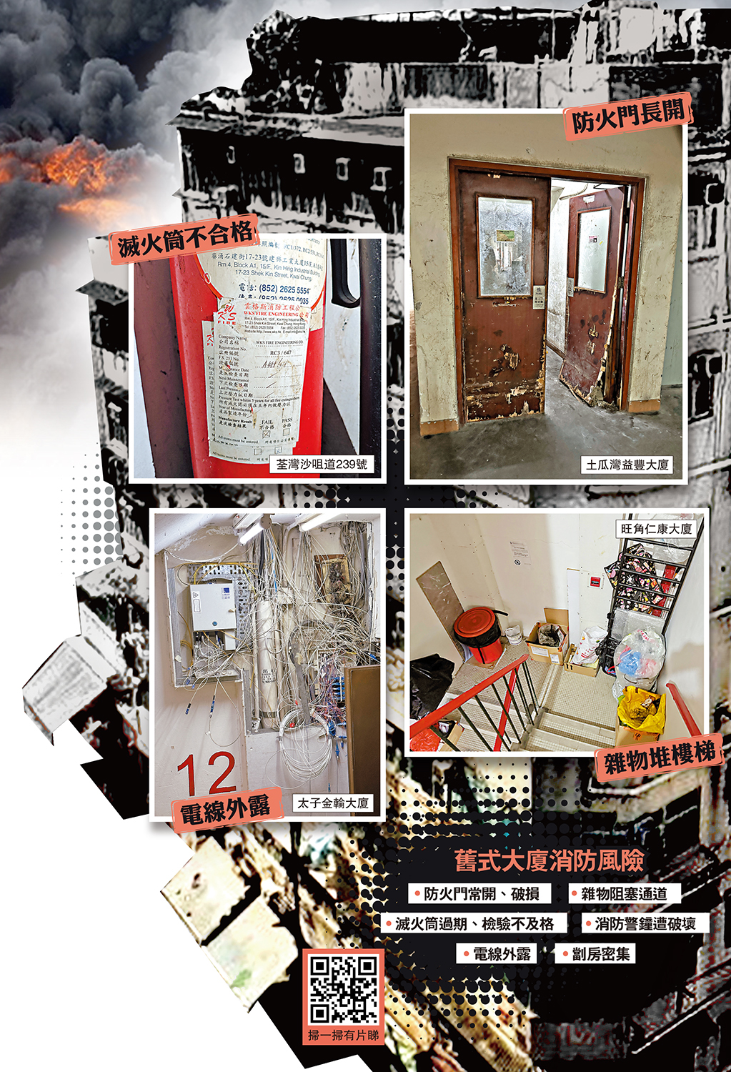 荃灣沙咀道坤德樓的三樓梯間,貼有一張2013年消防裝置及設備證書,手提式滅火桶檢查日期自2013年後便沒再更新;四樓梯間滅火桶的檢查結果為「不合格」。隔鄰的沙咀道237號大廈,沒有消防喉和滅火桶。而在沙咀道243號、川龍街38號及42號,記者發現沒標示檢查日期的滅火桶、被破壞的火警鐘,防火門常開,走廊堆積雜物,電線糾纏打結。