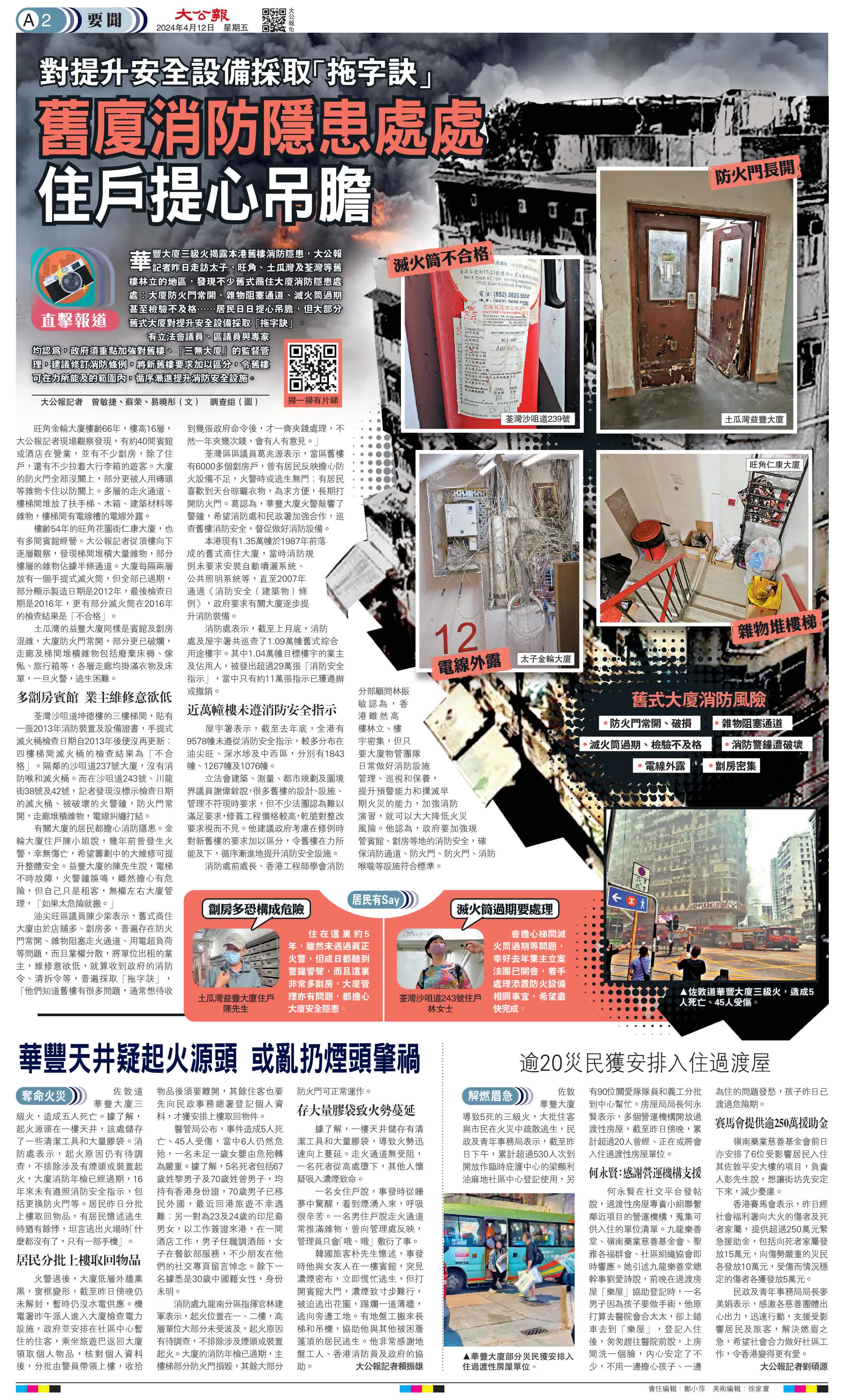 旺角金輪大廈樓齡66年,樓高16層,大公報記者現場觀察發現,有約40間賓館或酒店在營業,並有不少劏房,除了住戶,還有不少拉着大行李箱的遊客。大廈的防火門全部沒關上,部分更被人用磚頭等雜物卡住以防關上。多層的走火通道、樓梯間堆放了扶手梯、木箱、建築材料等雜物,樓梯間有電線槽的電線外露。