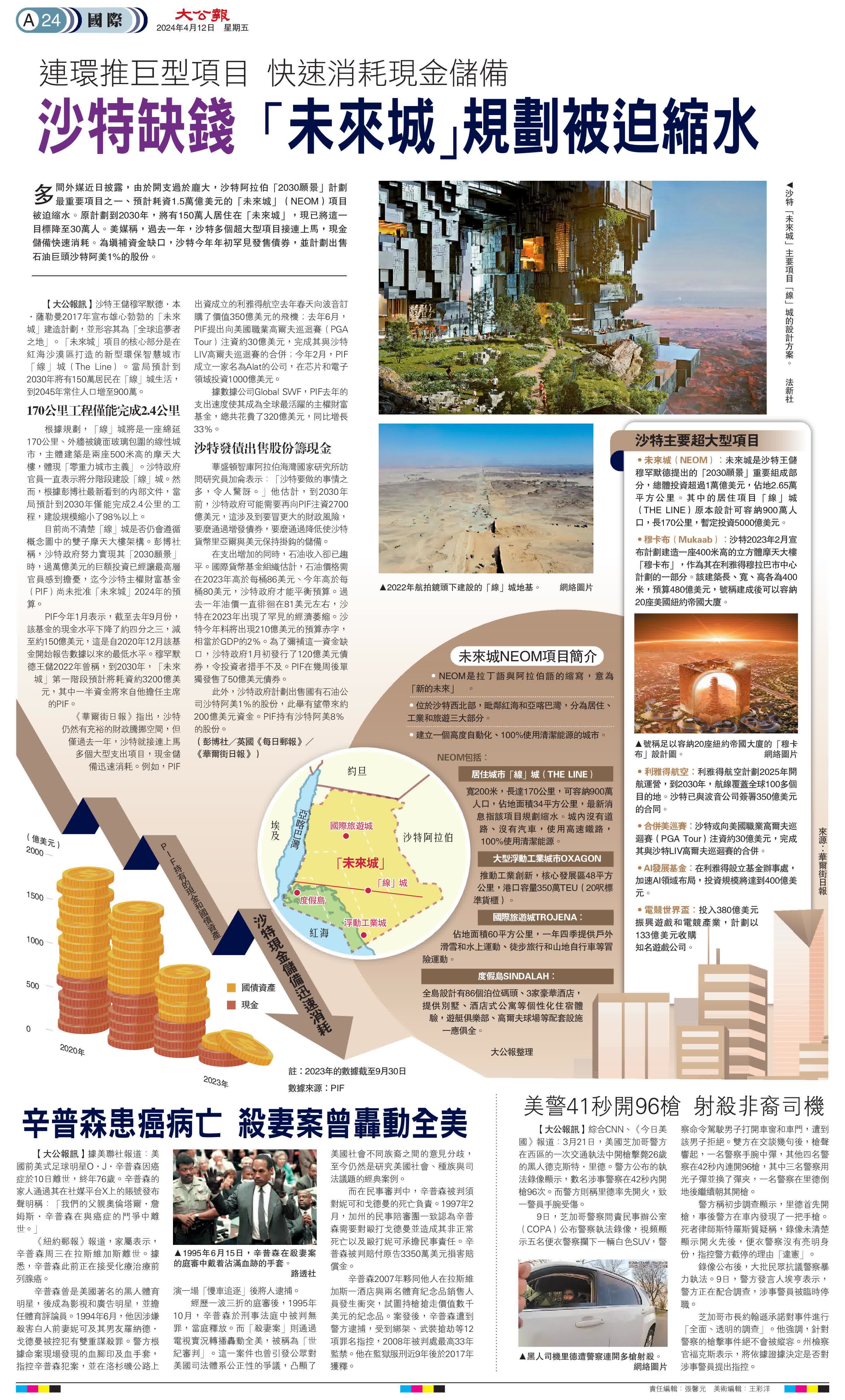 大公報報道:多間外媒近日披露,由於開支過於龐大,沙特阿拉伯「2030願景」計劃最重要項目之一、預計耗資1.5萬億美元的「未來城」(NEOM)項目被迫縮水。原計劃到2030年,將有150萬人居住在「未來城」,現已將這一目標降至30萬人。美媒稱,過去一年,沙特多個超大型項目接連上馬,現金儲備快速消耗。為填補資金缺口,沙特今年年初罕見發售債券,並計劃出售石油巨頭沙特阿美1%的股份。