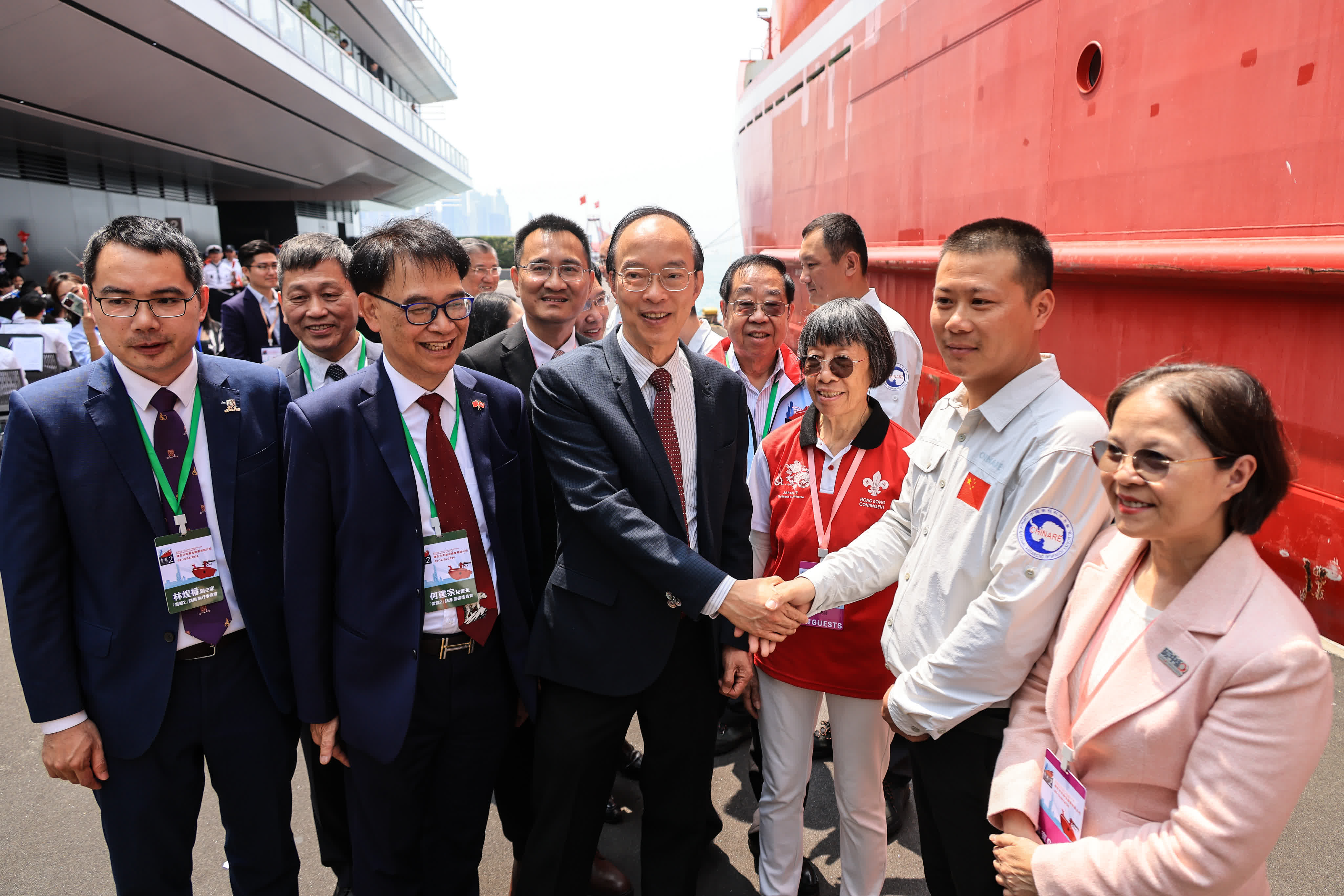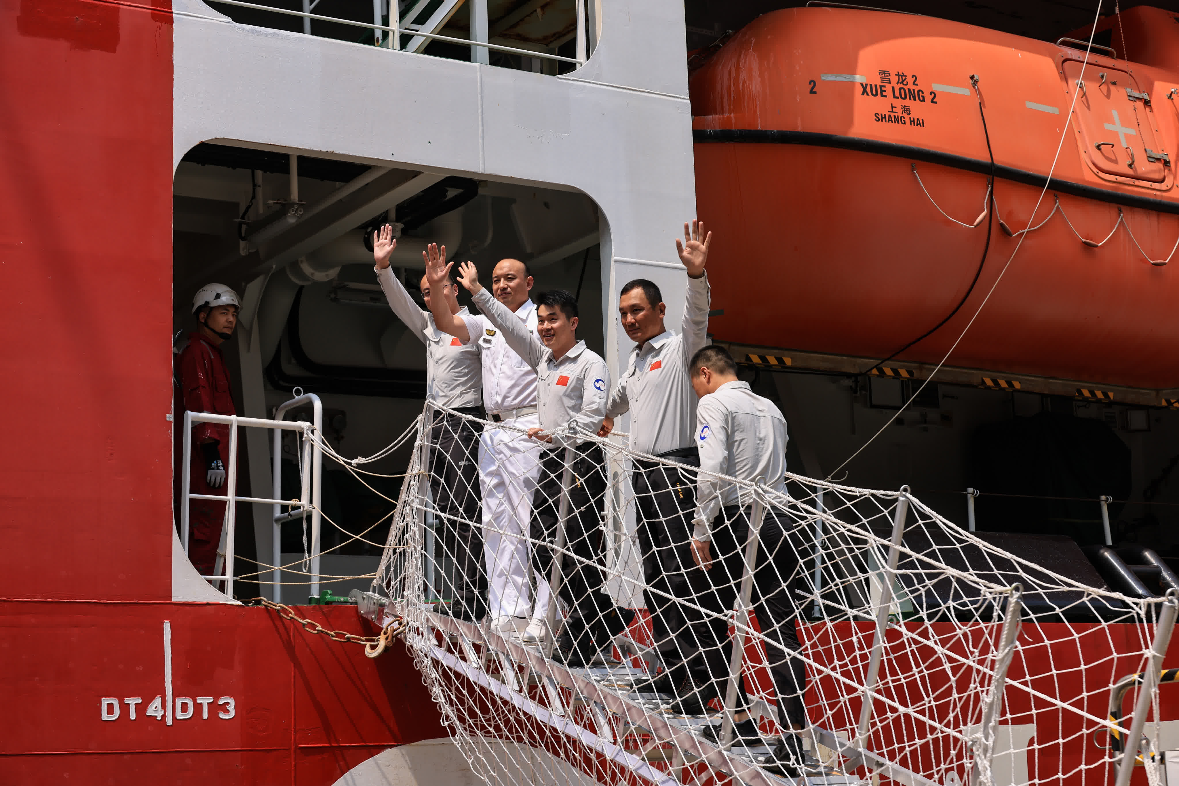 離港送船儀式在樂隊奏樂下進行,5名「雪龍2」號科考隊成員與港方人員握手道別。港方亦派出多艘船隻,包括海事處指揮船、消防船,以及5艘漁船,護送「雪龍2」號離港。