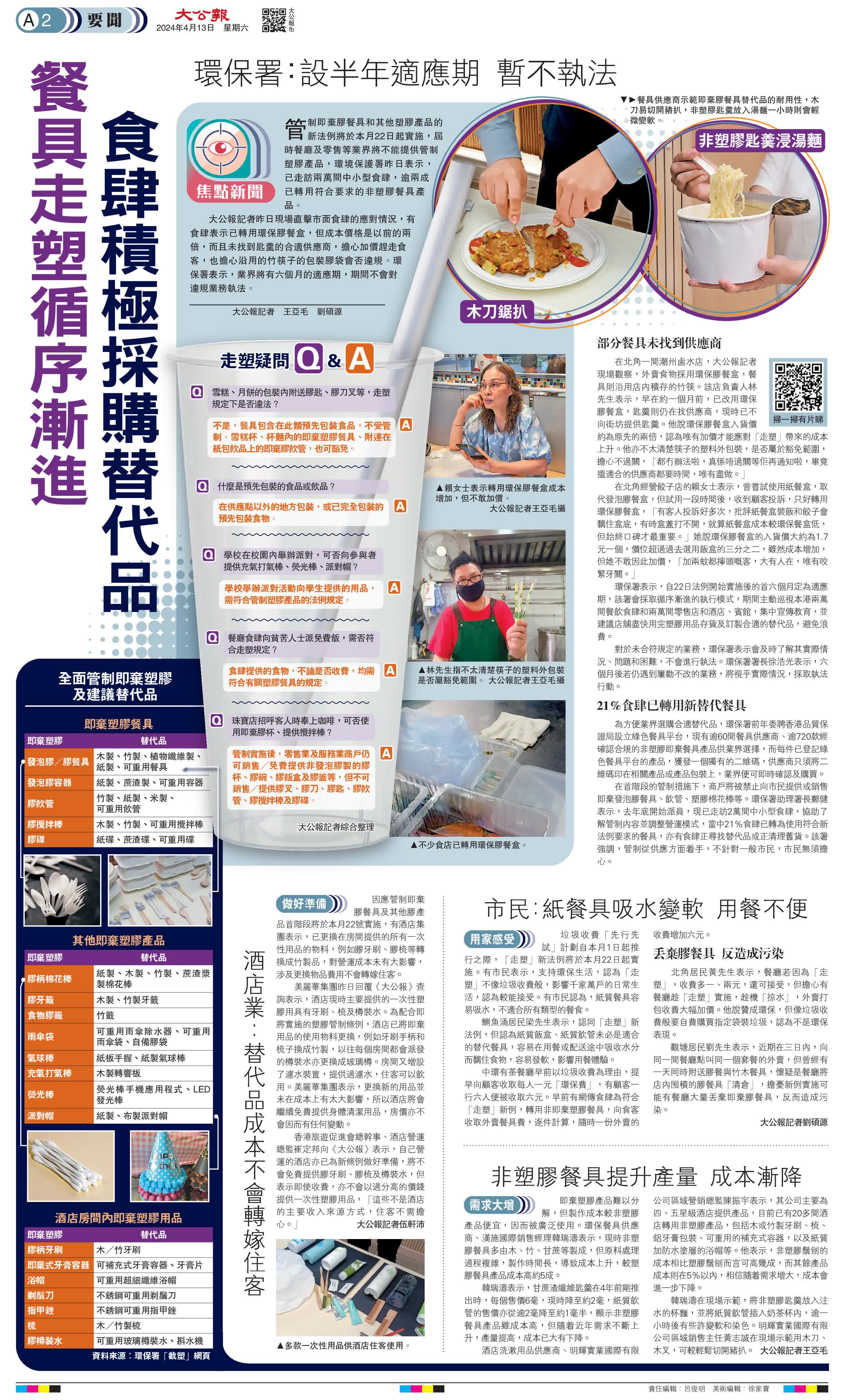 大公報記者昨日現場直擊市面食肆的應對情況,有食肆表示已轉用環保膠餐盒,但成本價格是以前的兩倍,而且未找到匙羹的合適供應商,擔心加價趕走食客,也擔心沿用的竹筷子的包裝膠袋會否違規。環保署表示,業界將有六個月的適應期,期間不會對違規業務執法。