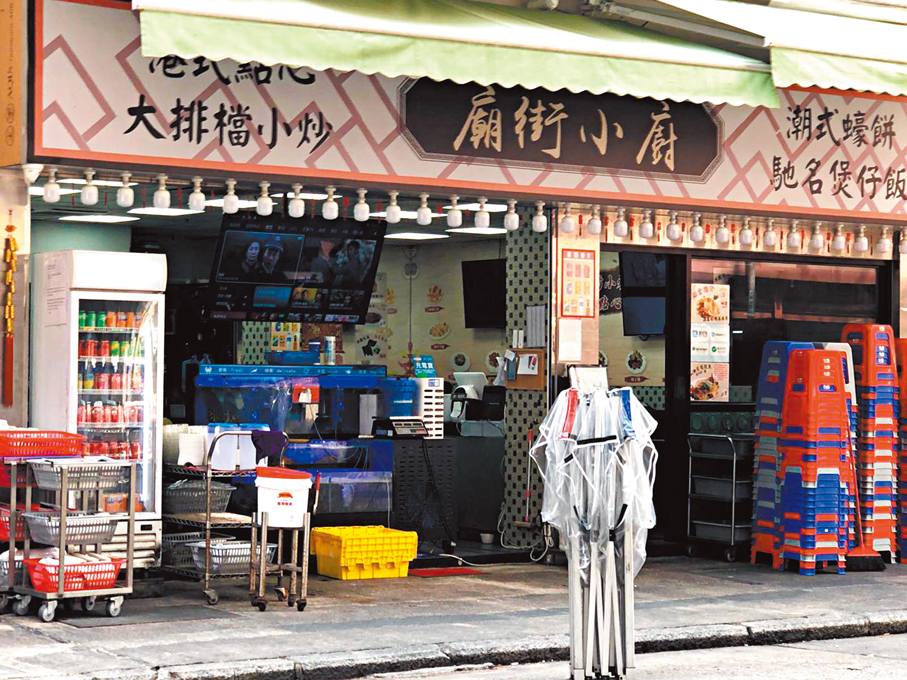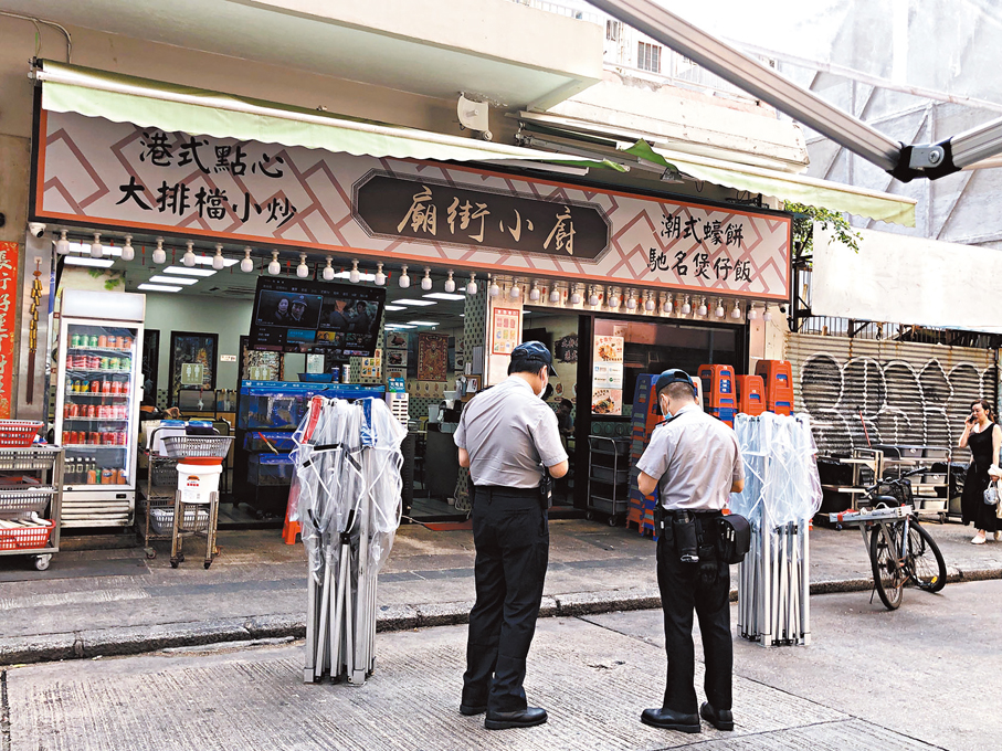 昨日下午3時許,香港文匯報記者到廟街了解情況,發現該兩間相關食肆已如常開門。其中,「聯發小廚」的招牌被人用紅紙遮上,紙上店名改為另一個名稱。多名職員正進行準備工作,並將枱椅及帳篷搬出對開馬路「擺陣」。