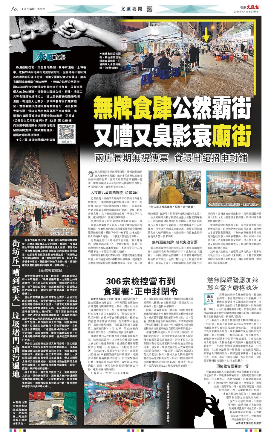 發言人表示,在2022年7月至今年3月期間,食環署共接獲437宗有關該兩間食肆的投訴,食環署同期共進行132次突擊執法行動,共提出306宗檢控。不過,該兩間食肆仍然持續無牌經營及阻塞公眾地方,食環署遂於上月根據《公眾衞生及市政條例》(第132章)向法庭申請封閉令,封閉相關處所,以徹底終止其違規情況,聆訊定於本月30日進行。