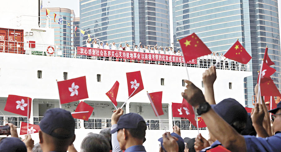 「雪龍2」號在完成國家第四十次南極考察後,歷史性地以香港為回航首站,昨日結束其在港的5天行程。離港送船儀式昨日在樂隊奏樂下進行,大批香港市民到岸邊送行。5名「雪龍2」號科考隊成員,包括國家第四十次南極考察副領隊魏福海、「雪龍2」號輪機長陳曉東、「雪龍2」號綜合隊隊長房吉闖、「雪龍2」號船載直升機「雪鷹301」機長張棟,以及秦嶺站建設隊員胡晴與香港特區政府環境及生態局副局長黃淑嫻、氣候變化專員黃傳輝等港方人員握手道別。