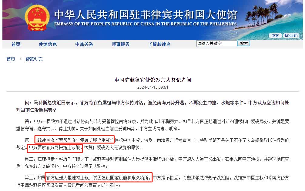 第三,如果菲方運送大量建材上艦,試圖建設固定設施和永久哨所,中方絕不接受,將堅決依法依規予以攔阻,以維護中國主權和《南海各方行中國駐菲律賓使館發言人答記者問為宣言》的嚴肅性。