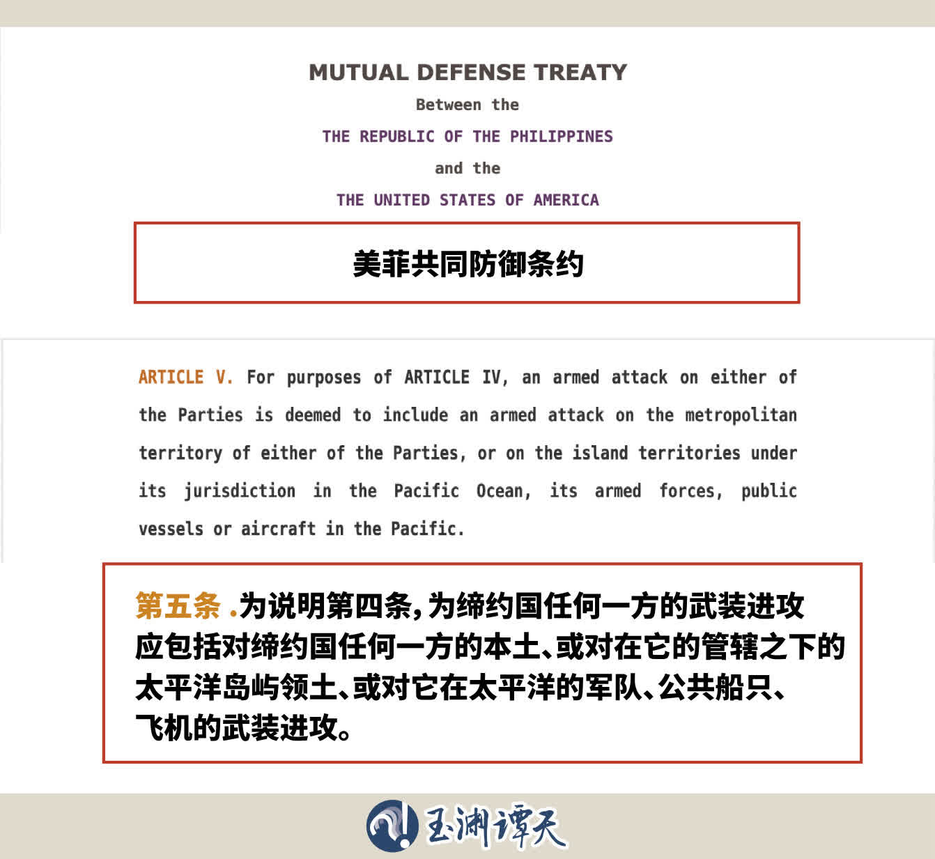 「……該條約延伸到在太平洋(包括南海任何地方)對菲律賓武裝部隊、公共船隻或飛機(包括其海岸警衛隊的船隻或飛機)的武裝攻擊……」