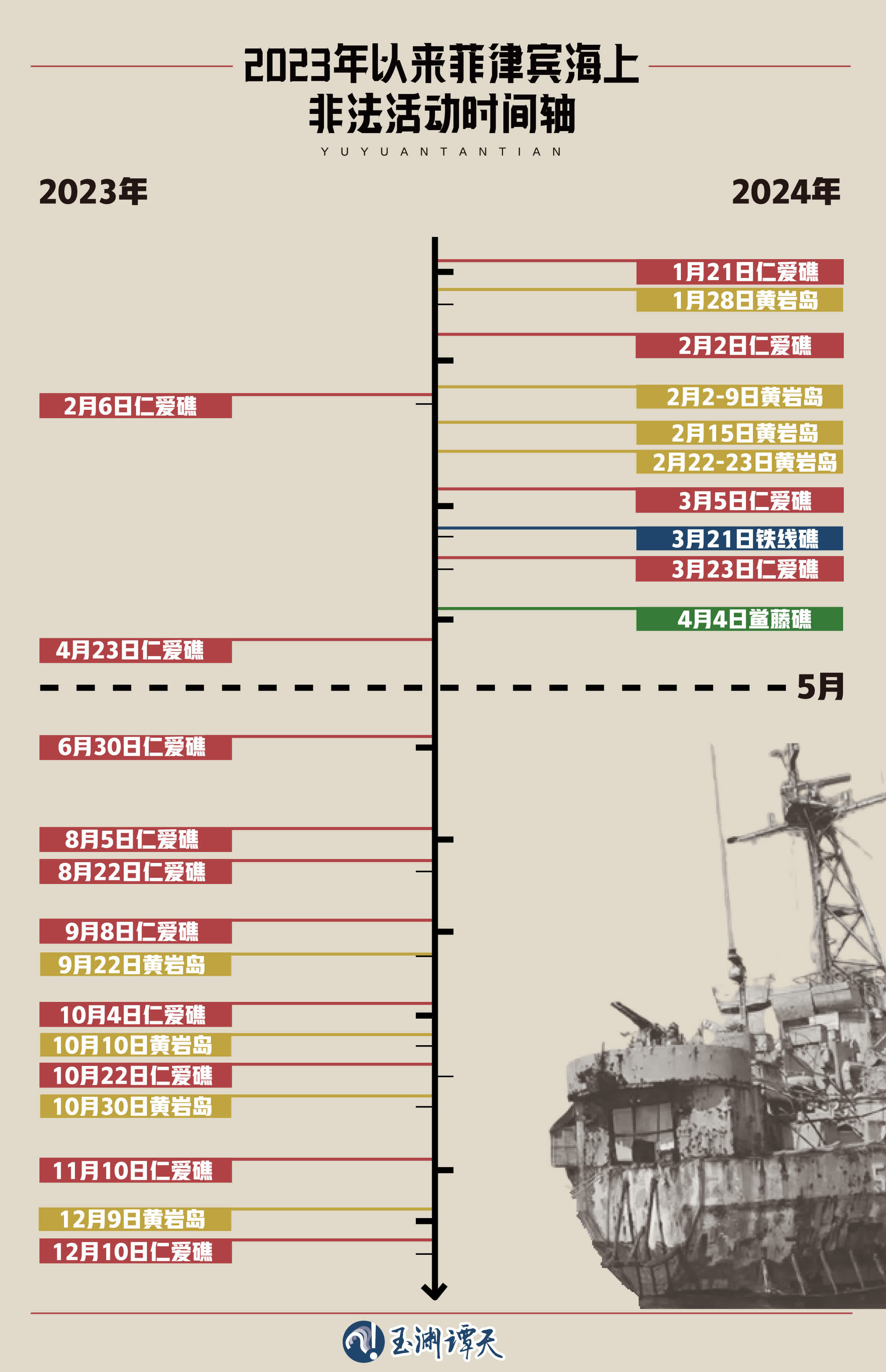 這是2023年以來,菲律賓在南海挑釁滋事的時間線,可以看到,在防務準則更新後,菲律賓在南海挑釁滋事的頻次驟增。