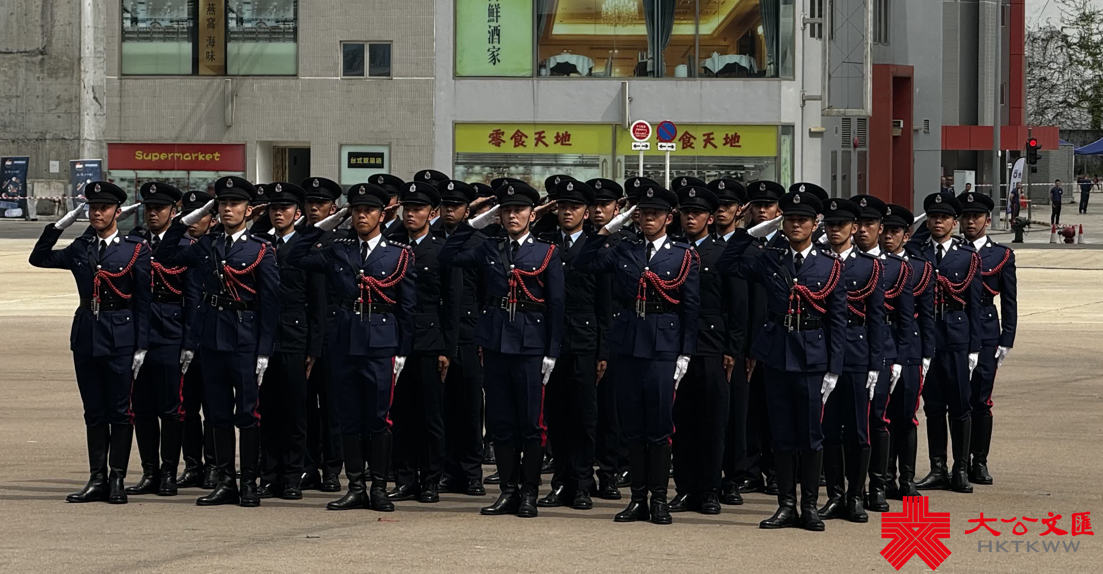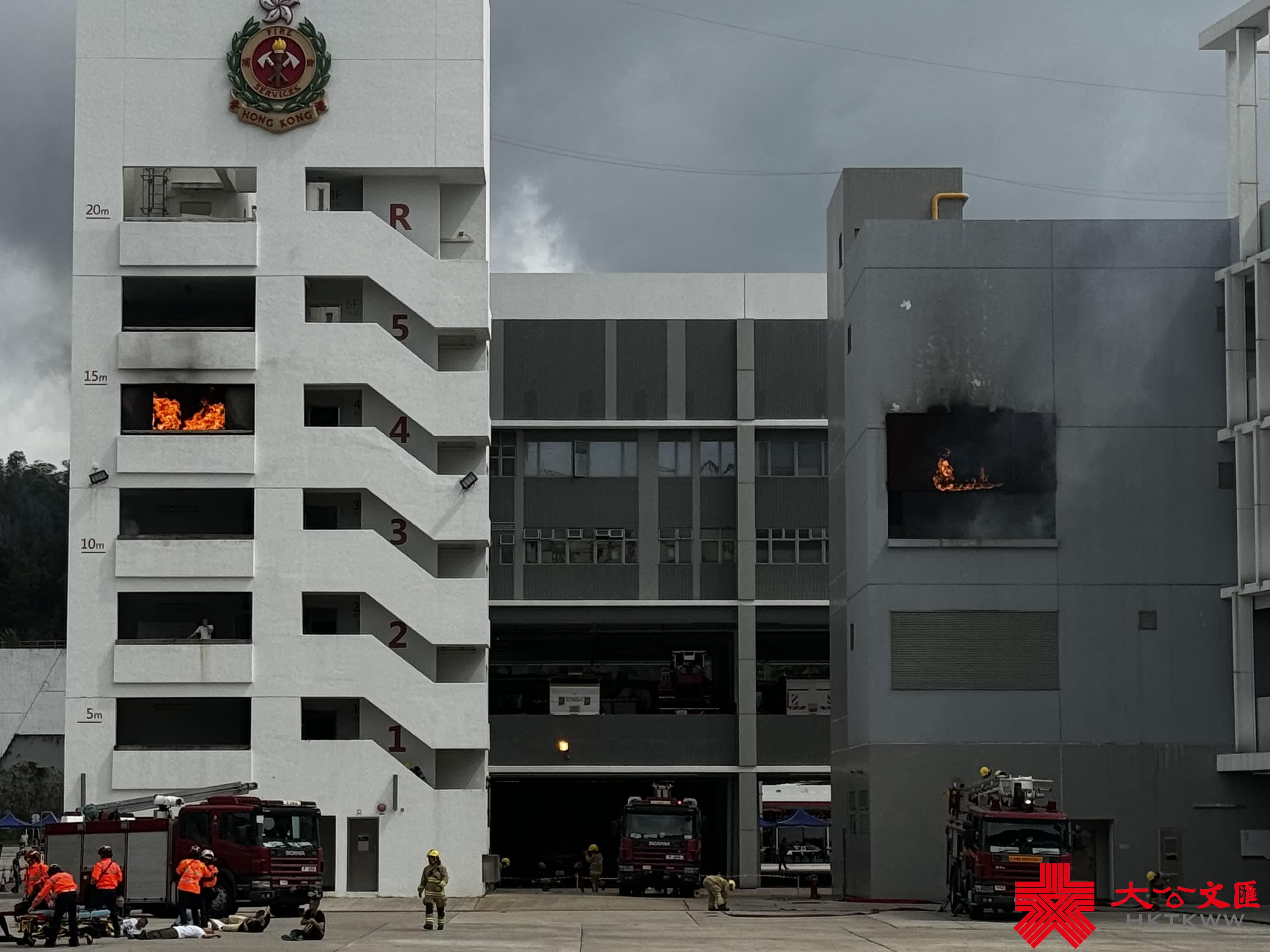 在升旗儀式後,消防員們向市民們展示中式步操。演示的重點環節是模擬鬧市區的樓宇突然出現火情和爆炸時,消防員和救護員的緊急處理程序。只見幾位「市民」正在街上行走,突然間聽到身後的樓宇中傳出一聲爆炸,並燃起了熊熊大火,隨後旁邊的樓宇也有火焰冒出。行人當即被爆炸的壓力撲倒在地上,有受傷跡象。隨後消防車、救護車以及警車緊急到場。在第一時間,救護車將傷者在現場進行檢傷後,有次序地送往醫院,而消防員則立即搭起雲梯,拿起水喉救火。救護人員在現場離火源較遠的空地上搭建了臨時指揮中心。看到驚心動魄的演示,觀眾席響起掌聲。