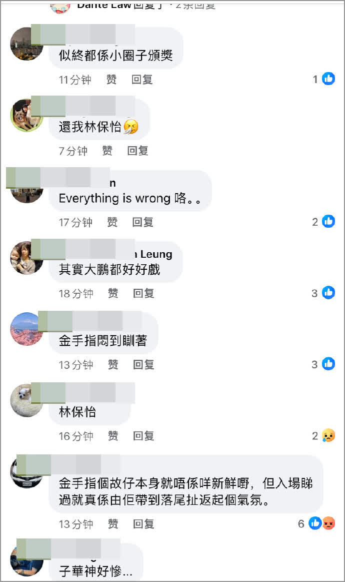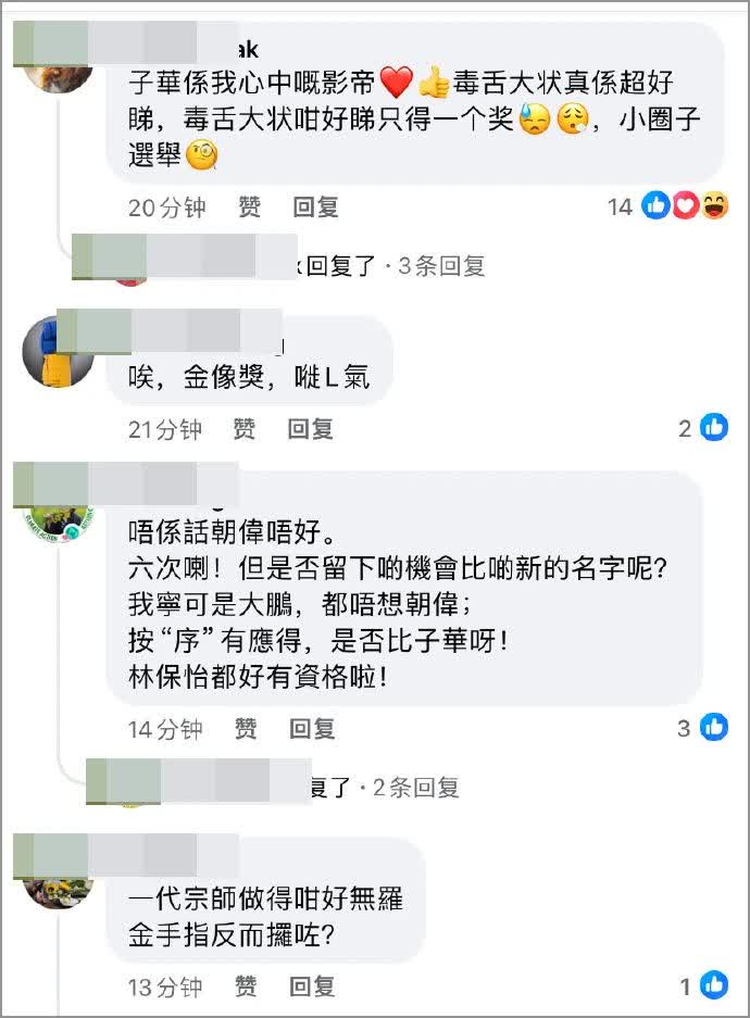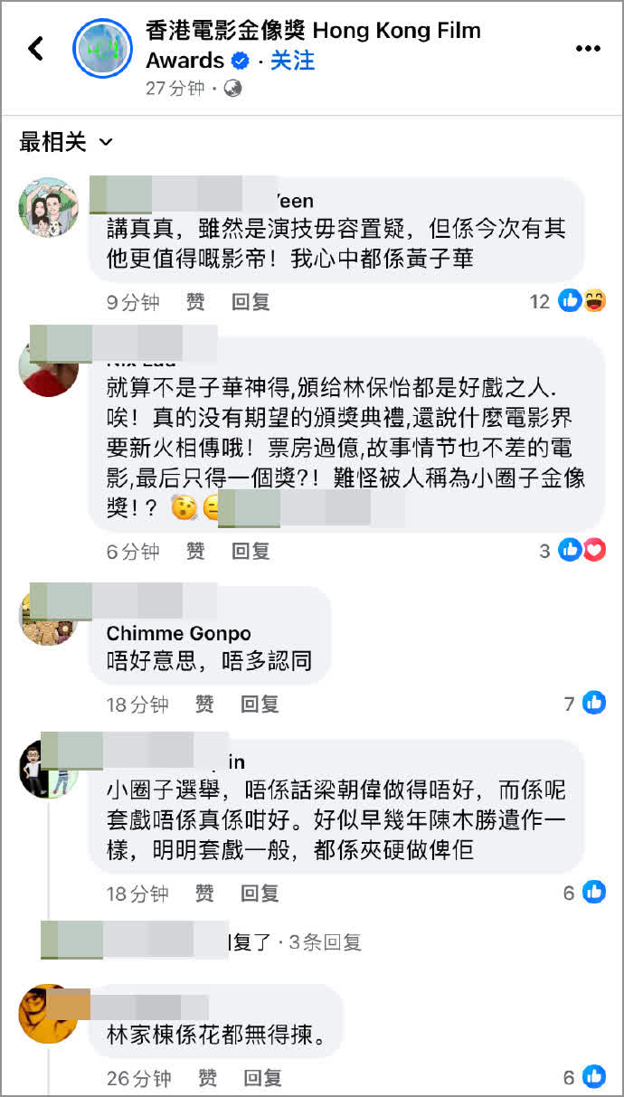在「香港電影金像獎」的官方帳號下,香港網友都在為林保怡和黃子華感到惋惜。