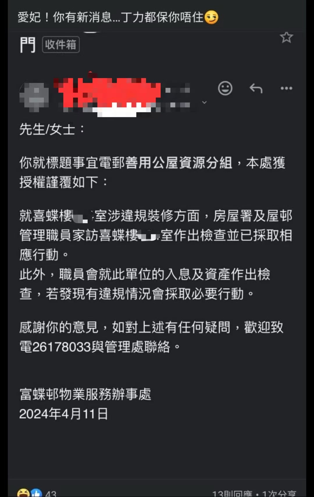 帖文隨後引起熱議,有網友發現該女子疑似拆走原裝廚房門改成摺門,或違反房屋署「業主固定裝置分類」指引;有人「預言」房署好快就會找上門,建議業主「畀錢還原啦」。未幾,有網民發文證實,確實有人向房屋署舉報,並於4月11日收到回覆,稱房屋署及屋邨管理職員已家訪喜蝶樓相關單位檢查,已對有關單位採取相應行動,並指會對其進行「入息及資產」檢查,若發現有違規情況,會採取必要行動。