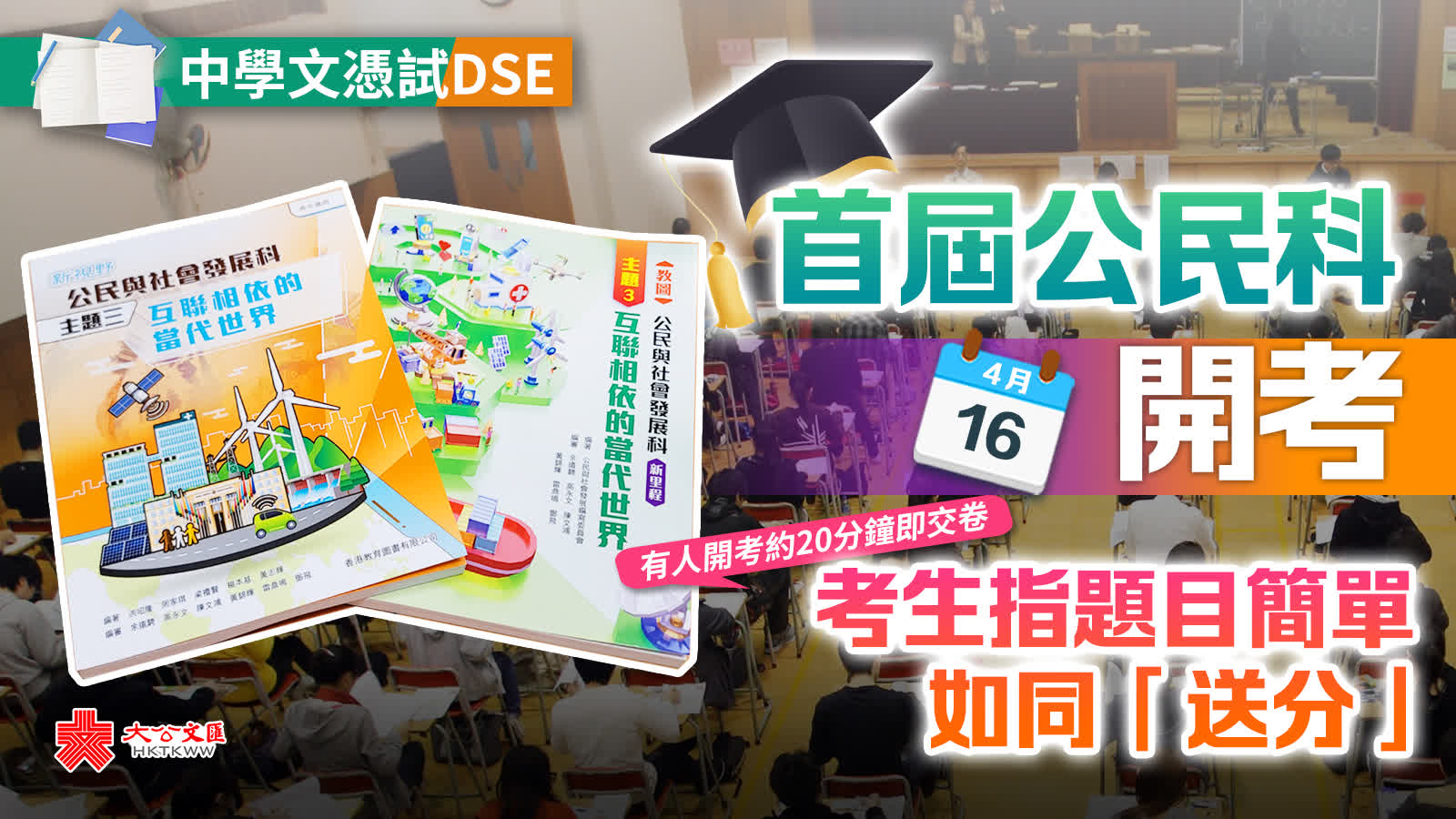 大公文匯全媒體報道,中學文憑試(DSE)首屆公民與社會發展科今日(16日)開考,公民科不會如以往通識科設等級,而是以達標與否評核考生水平。據悉,試卷分為資料冊和試題答題簿,全卷共有5題多項選擇題,亦設有長題目要求學生使用資料答題。雖然沒有歷屆試題可以參考,但不少考生認為題目十分簡單,如同「送分」,有人開考約20分鐘即交卷。