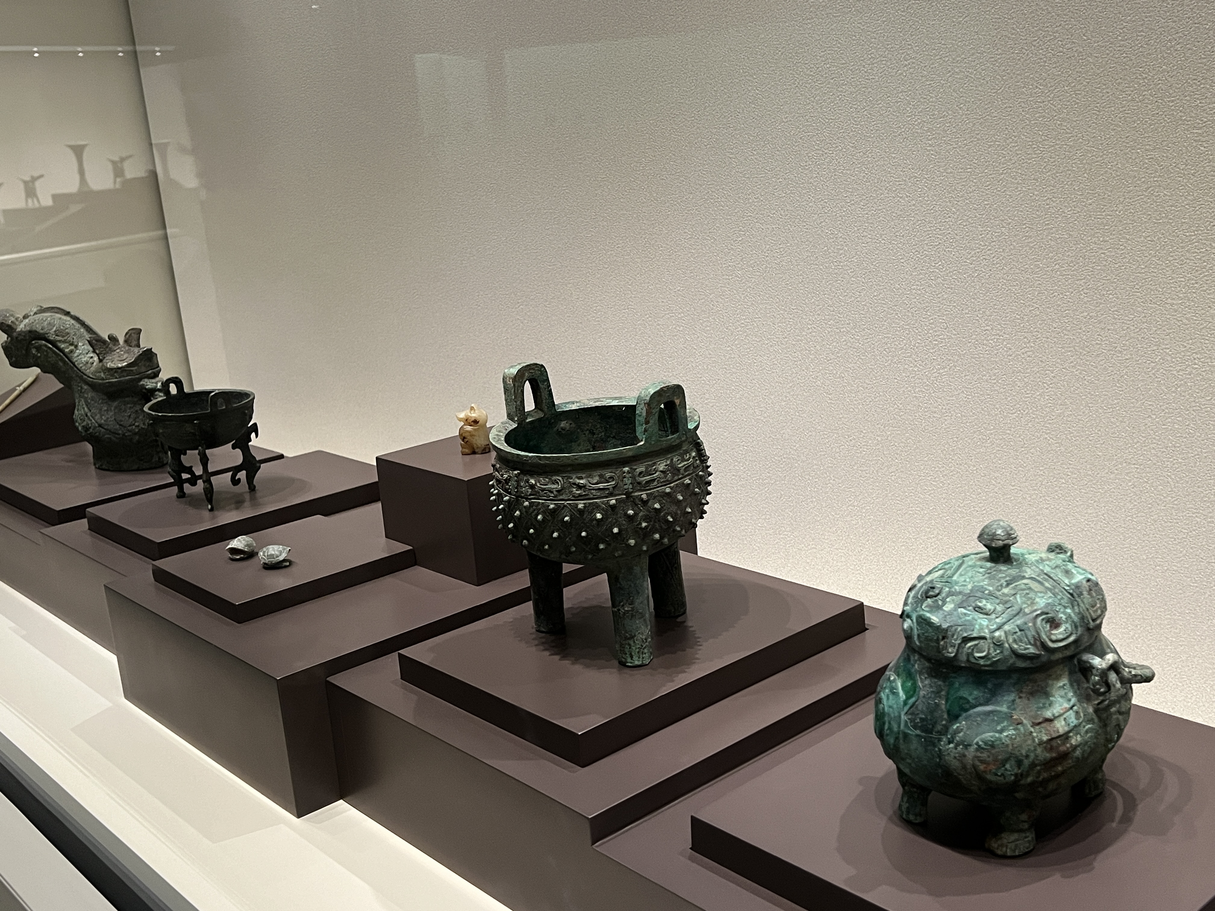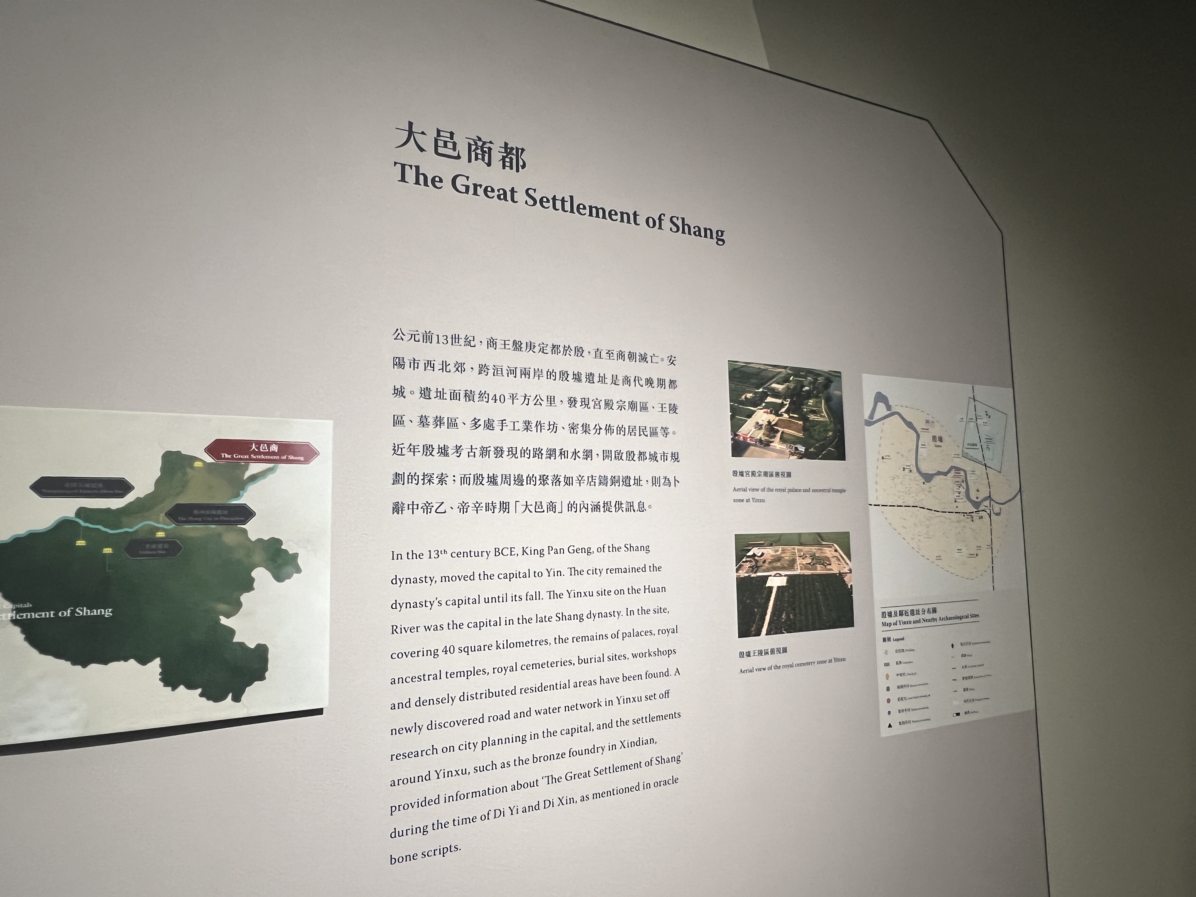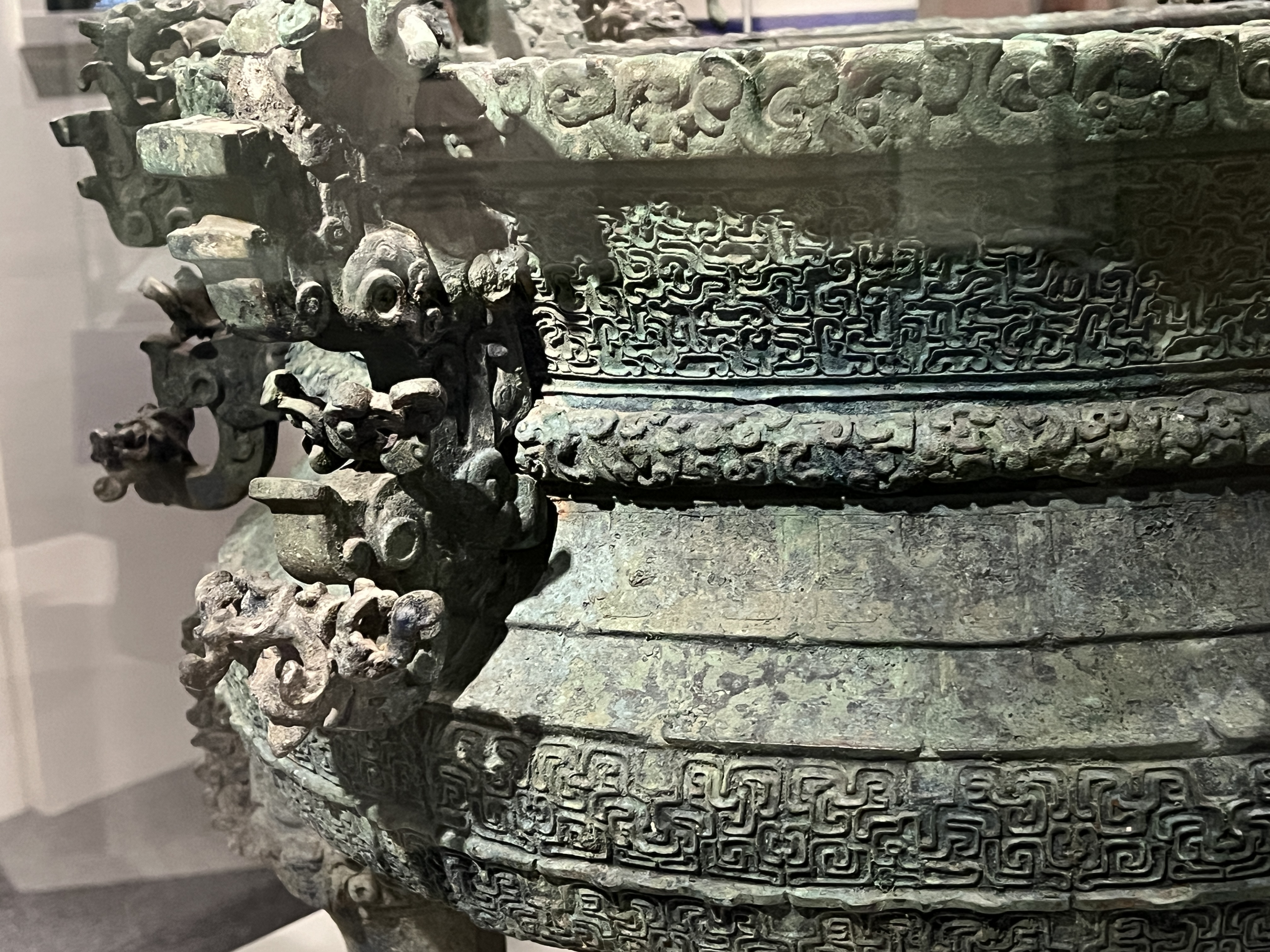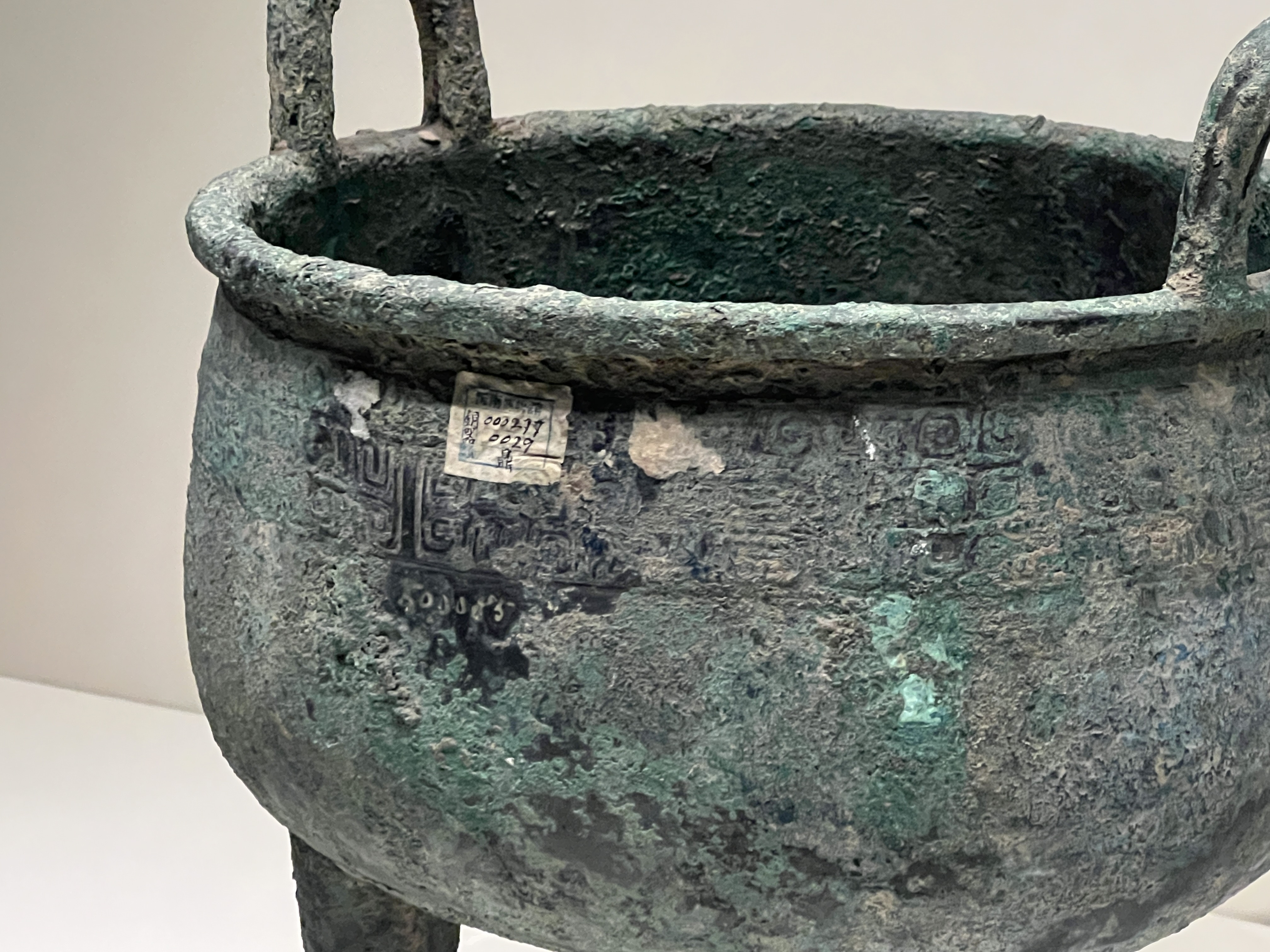 成立於1927年的河南博物院歷史悠久,曾經經歷抗戰。展櫃中貼着標籤的饕餮紋鼎早在1928年已經出現在河南的博物館,抗日戰爭時,許多在內地博物館的文物都要南遷到成都,其中就包括河南博物館的展品,這些貼在文物上的標籤便承載了南遷這段歷史。「希望透過考古的歷史、夏商周的歷史,說一些近代史」,黃潤釗如是說。
