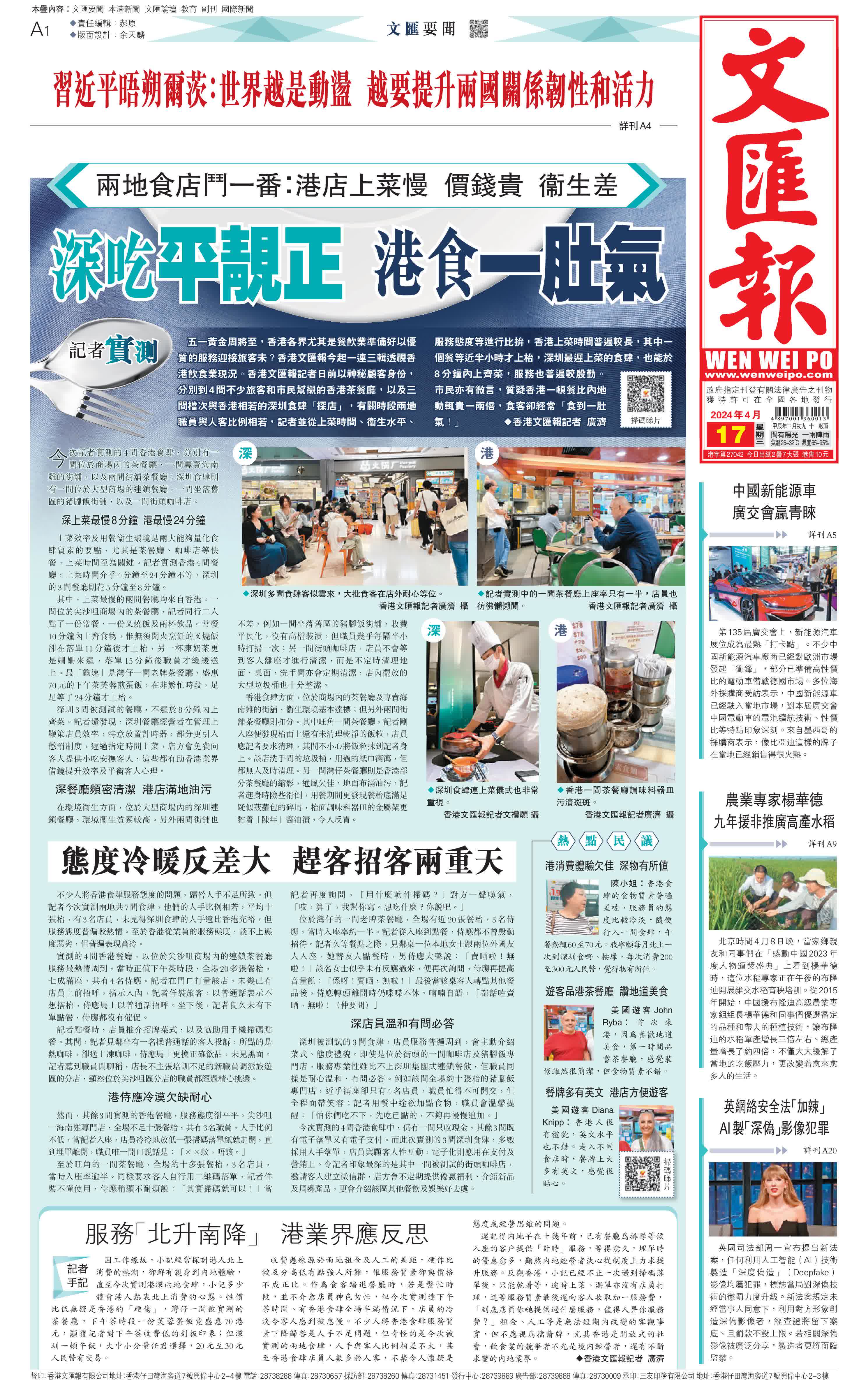 (香港文匯報記者 廣濟)五一黃金周將至,香港各界尤其是餐飲業準備好以優質的服務迎接旅客未?香港文匯報今起一連三輯透視香港飲食業現況。香港文匯報記者日前以神秘顧客身份,分別到4間不少旅客和市民幫襯的香港茶餐廳,以及三間檔次與香港相若的深圳食肆「探店」,有關時段兩地職員與人客比例相若,記者並從上菜時間、衞生水平、服務態度等進行比拚,香港上菜時間普遍較長,其中一個餐等近半小時才上枱,深圳最遲上菜的食肆,也能於8分鐘內上齊菜,服務也普遍較殷勤。市民亦有微言,質疑香港一頓餐比內地動輒貴一兩倍,食客卻經常「食到一肚氣!」