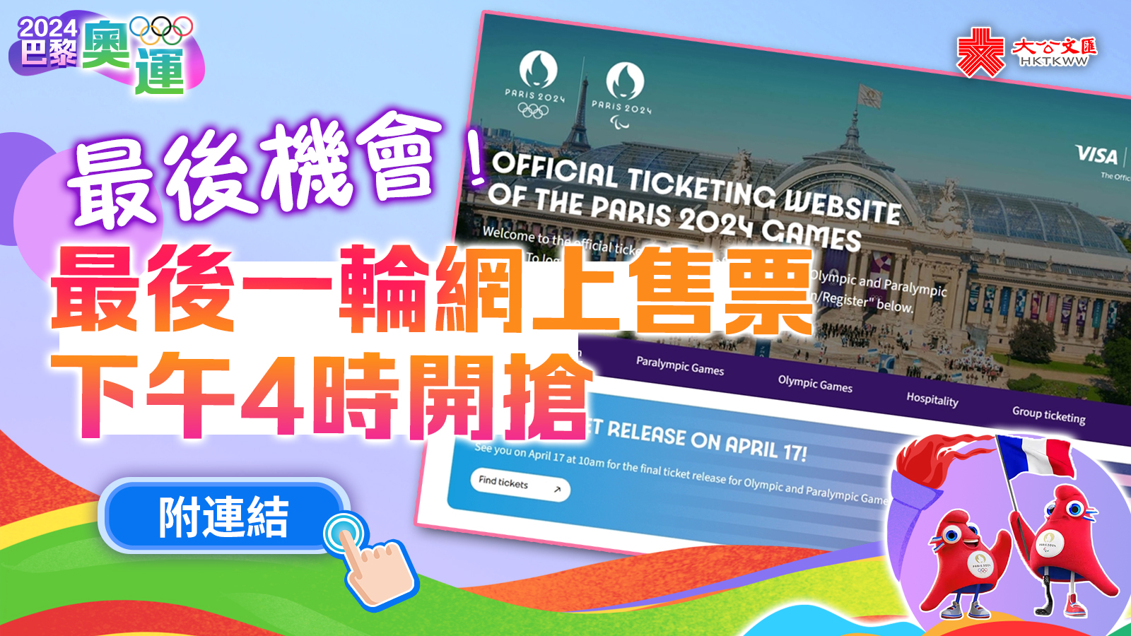 大公文匯全媒體報道,4月17日是2024年巴黎奧運倒計時100天。巴黎奧運會官網發布最新消息,新一批超過25萬張巴黎奧運及殘奧門票,將於當地時間4月17日上午10時(香港時間下午4時)在官方票務網站上發售。網站顯示,這是巴黎奧運會開始前,所有比賽項目的最後一次售票,「now or never」。