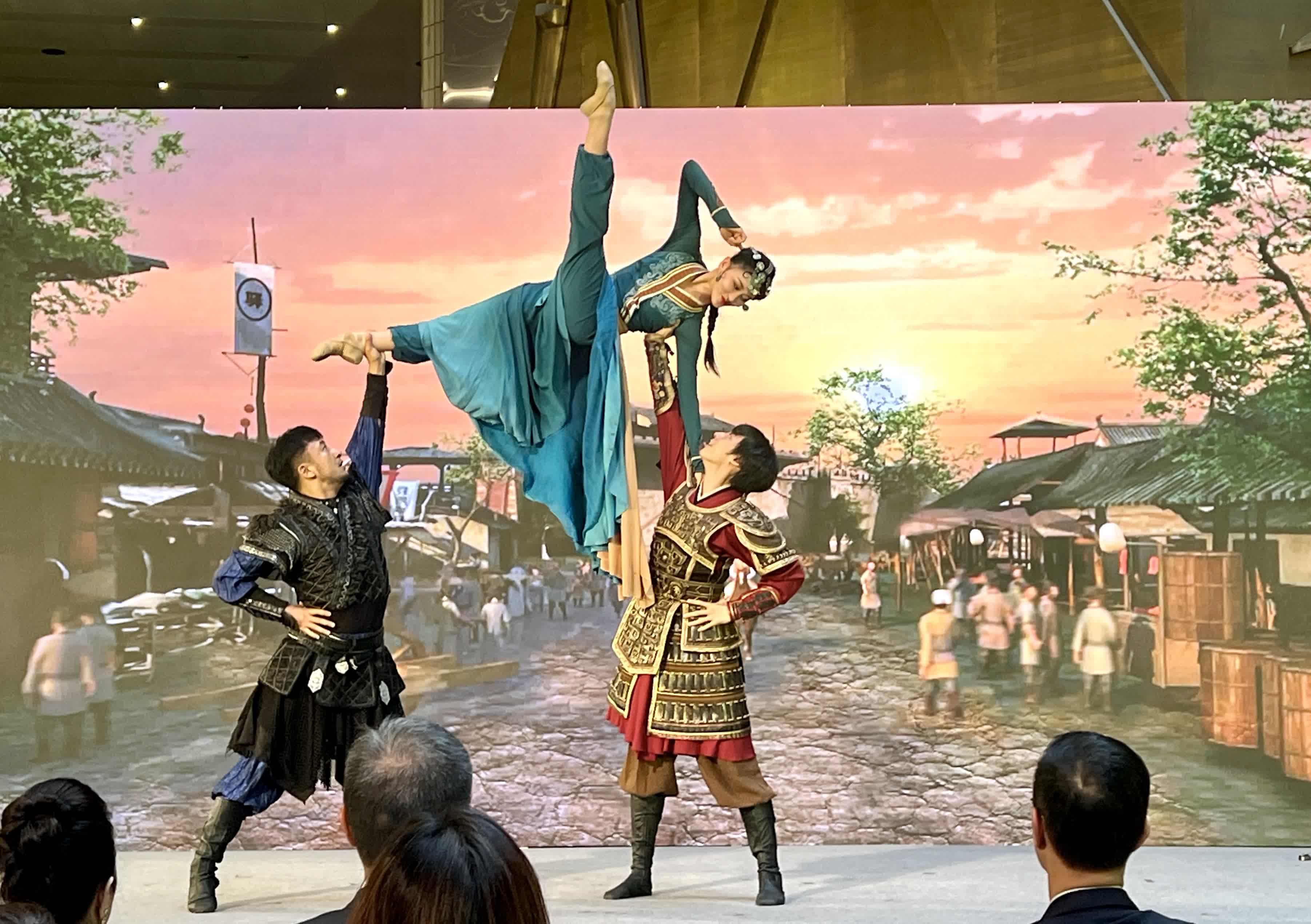 隨後,北京歌劇舞劇院的4位演員現場展示舞劇《五星出東方》選段。北京演藝集團副總經理、《五星出東方》制作人董寧女士介紹,該舞劇的創作靈感來源於1995年在新疆和田地區尼雅遺址古墓中發現的漢朝織錦護臂,這是在中國新疆發現的首個帶有「中國」字樣的文物,其歷史價值讓人震撼。蜀地的織錦跨越千里出現在新疆大漠,可見古絲綢之路之暢通、中華各民族之融合,她希望能夠藉此讓觀眾在「笑中帶淚」的舞蹈故事中了解幾千年前的中國。