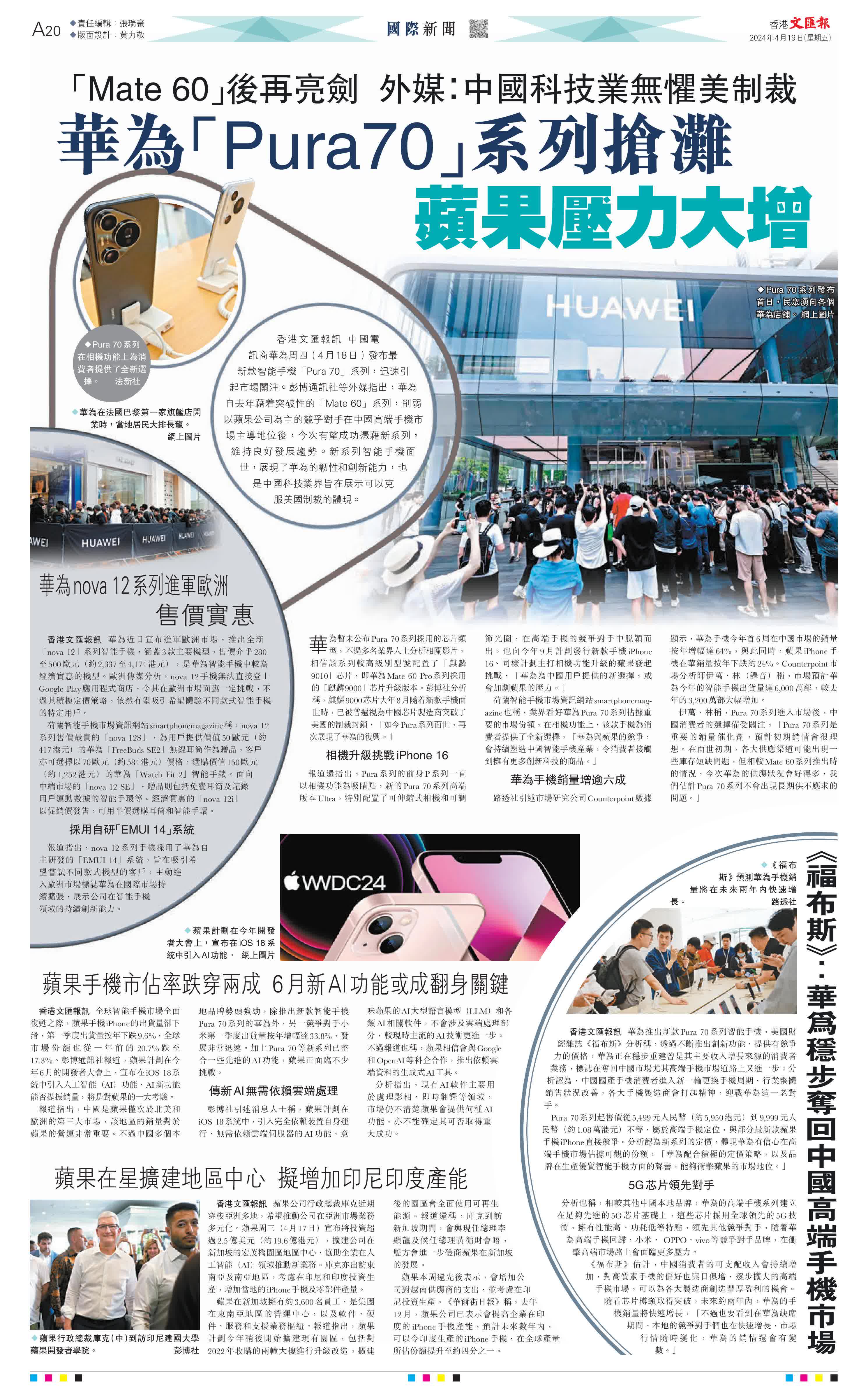 香港文匯報報道,中國電訊商華為周四(4月18日)發布最新款智能手機「Pura 70」系列,迅速引起市場關注。彭博通訊社等外媒指出,華為自去年藉着突破性的「Mate 60」系列,削弱以蘋果公司為主的競爭對手在中國高端手機市場主導地位後,今次有望成功憑藉新系列,維持良好發展趨勢。新系列智能手機面世,展現了華為的韌性和創新能力,也是中國科技業界旨在展示可以克服美國制裁的體現。