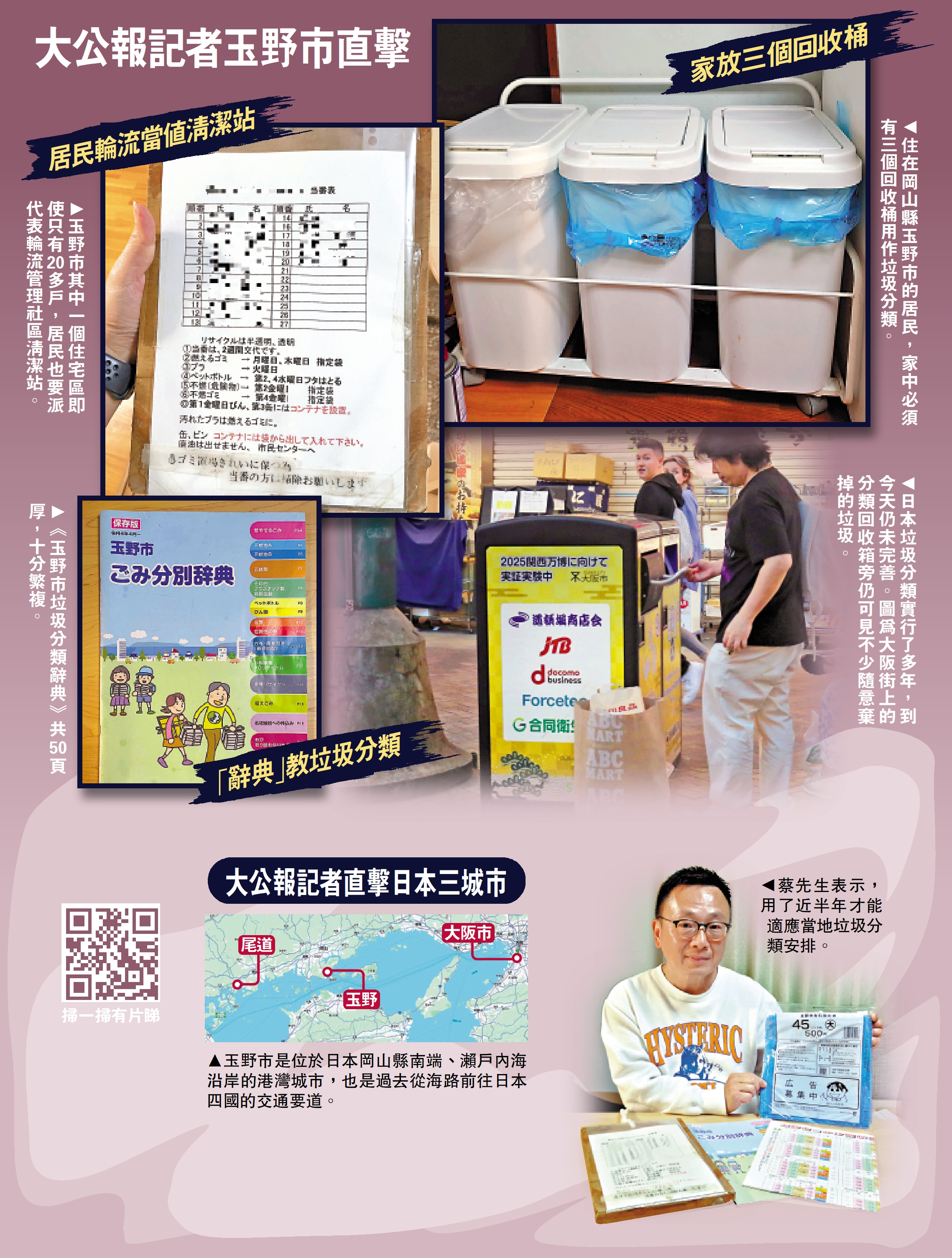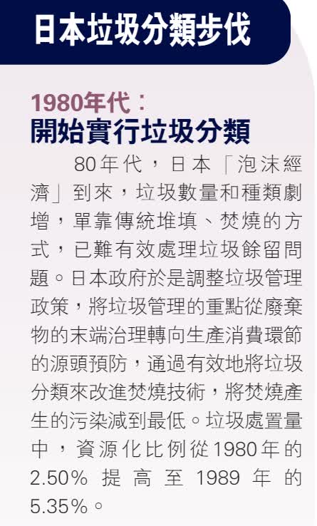 移居玉野市的港人蔡先生,從「日日睇住本天書」做垃圾分類,到成為社區清潔站的輪更當值人,體會到香港與日本的差異,他認為推行垃圾收費,與國民教育、回收配套、社區文化等息息相關,但是香港這些方面難以照抄日本做法,仍需要「行一段很長的路」。