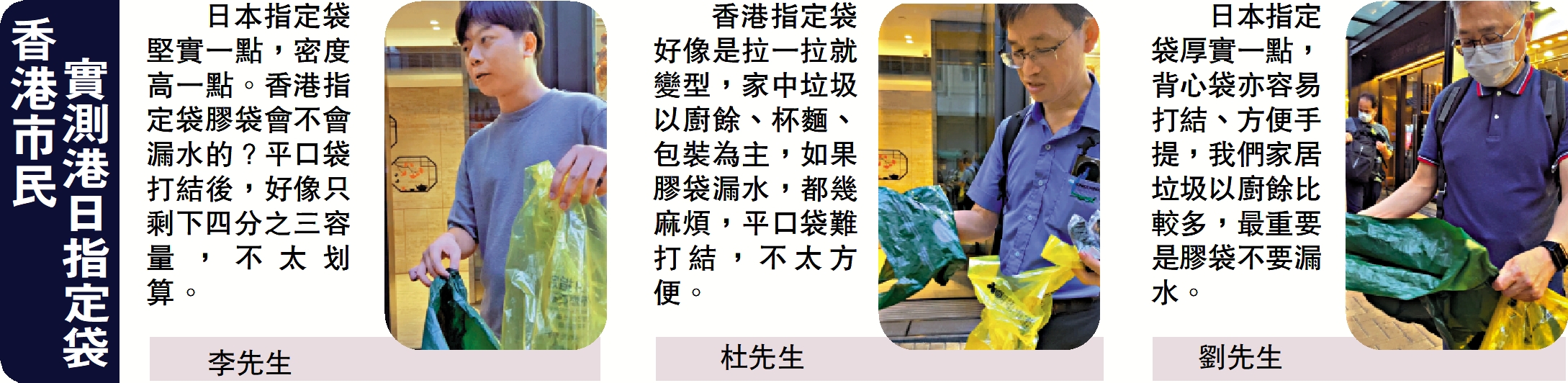 實測結果發現,市民普遍關注指定袋的質量,有市民擔心香港細尺寸指定袋太薄,或容易漏水;有市民認為,香港20公升以上的指定袋用平口袋設計,不及日本的背心袋設計裝得多;亦有市民認為,日本指定袋為全透明,私隱度不足,覺得香港指定袋更好。