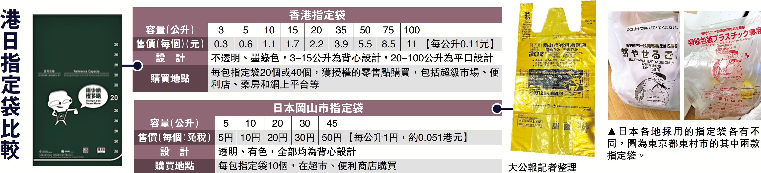 大公報記者特意在日本岡山市購買當地的指定袋,帶回香港,請香港市民親眼看看、親手摸摸兩地的指定袋,比較兩者的異同。